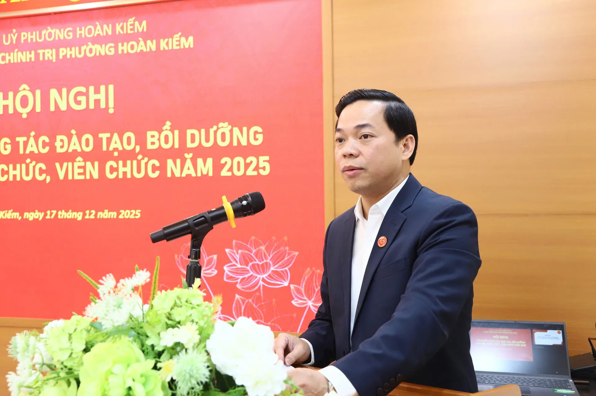 Giám đốc Trung tâm Chính trị phường Hoàn Kiếm Nguyễn Văn Phú trình bày tóm tắt báo cáo tổng kết công tác bồi dưỡng, tập huấn cán bộ năm 2025, phương hướng nhiệm vụ trọng tâm năm 2026.