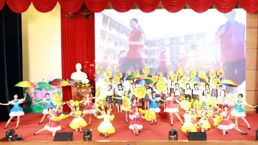 Tiết mục văn nghệ của các em học sinh thay lời tri ân tới đội ngũ cán bộ, giáo viên ngành giáo dục Hoàng Liệt. Ảnh HH