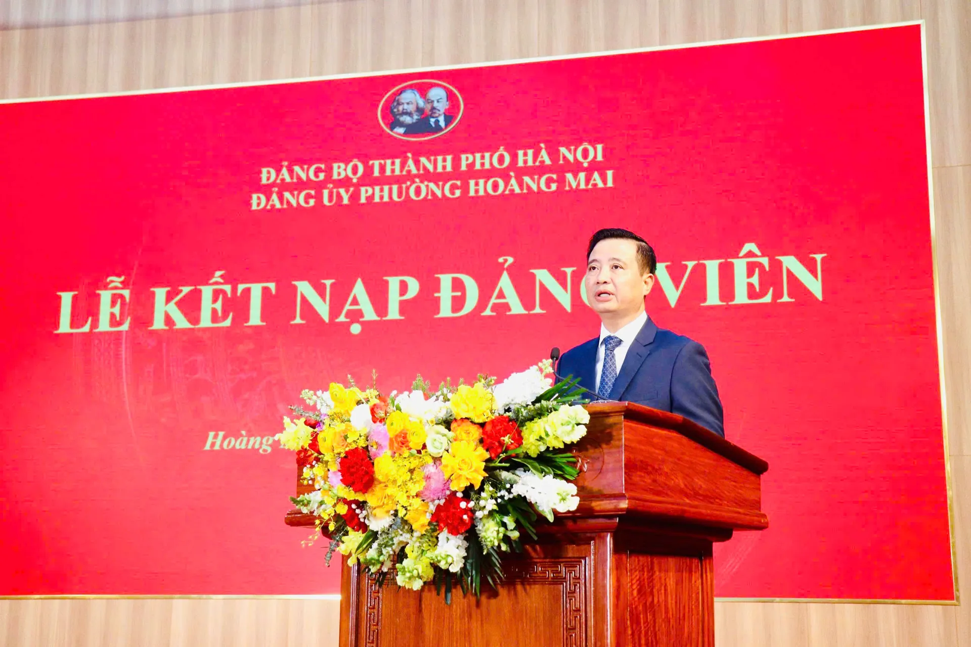 Phát biểu và giao nhiệm vụ, Bí thư Đảng ủy, Chủ tịch HĐND phường Hoàng Mai Nguyễn Xuân Linh gửi lời chúc mừng tới 43 thanh niên nhập ngũ năm 2026 và 5 thanh niên ưu tú được kết nạp Đảng.