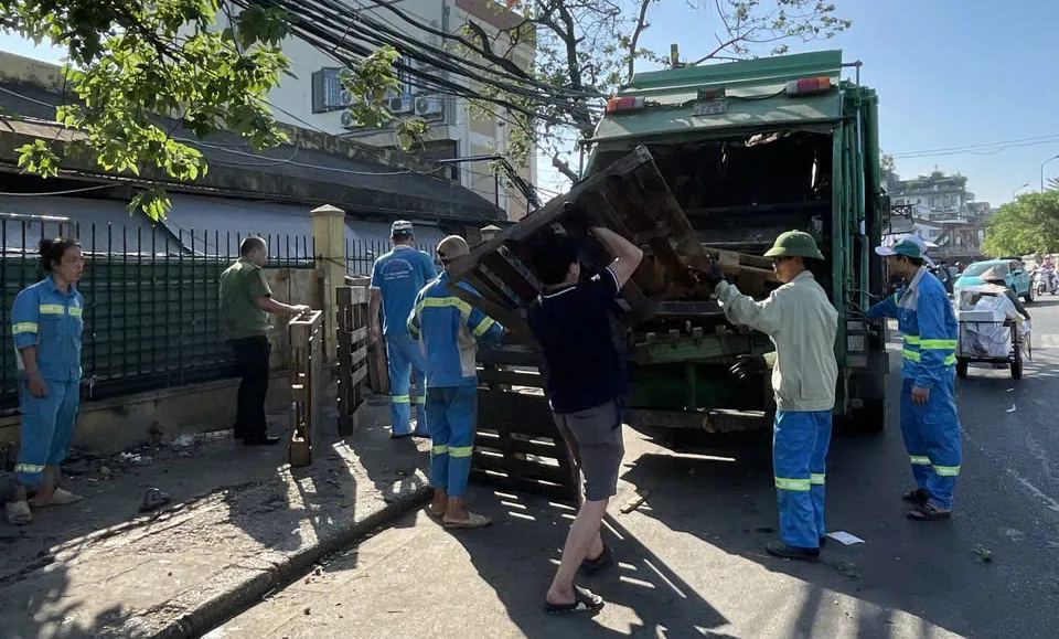 Lực lượng chức năng tổ chức thu dọn các loại rác thải cồng kềnh bị tập kết sai quy định.