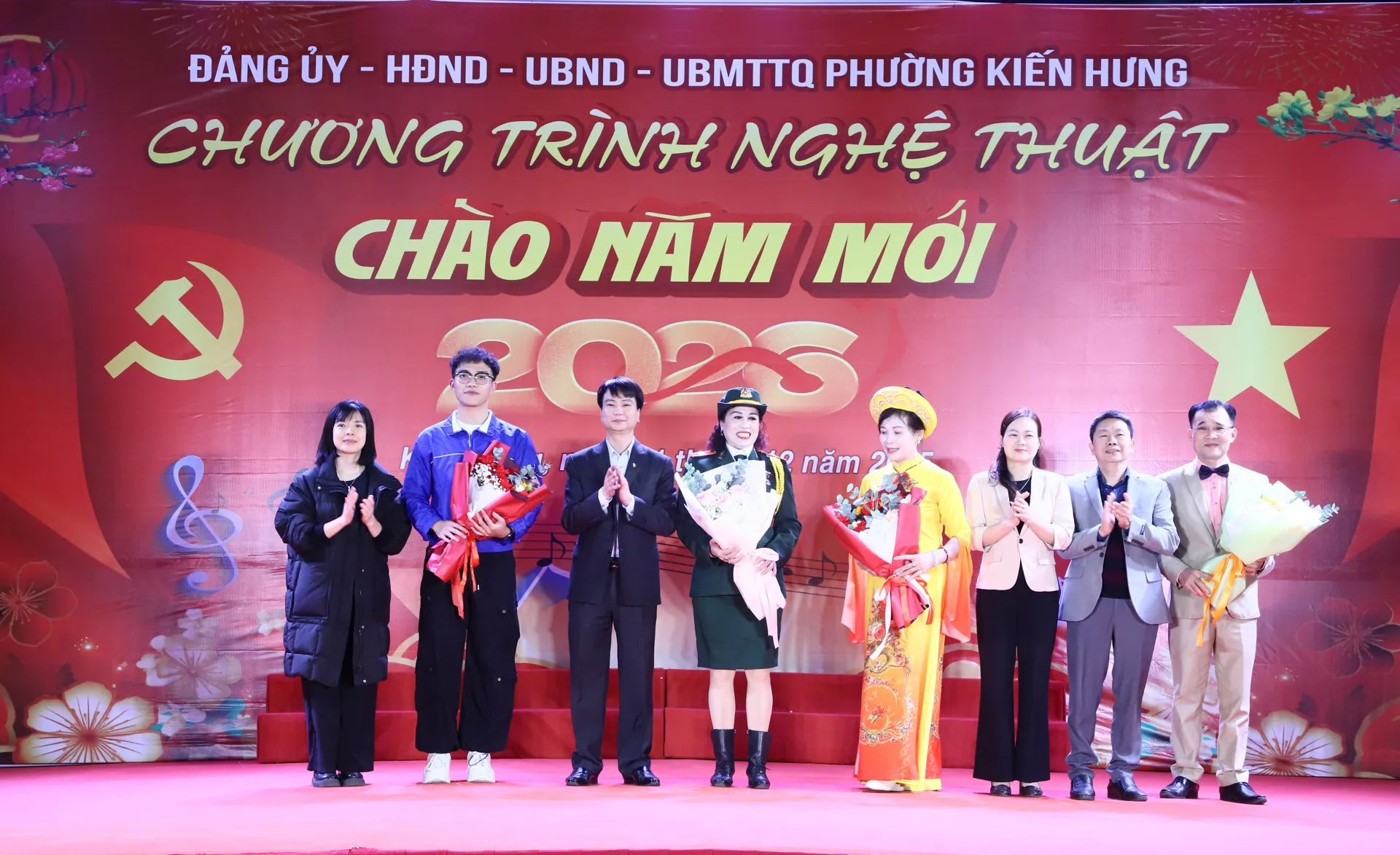 Lãnh đạo Đảng ủy - HĐND - UBND - Ủy ban MTTQ Việt Nam phường Kiến Hưng tặng hoa chúc mừng các tiết mục tham gia chương trình.