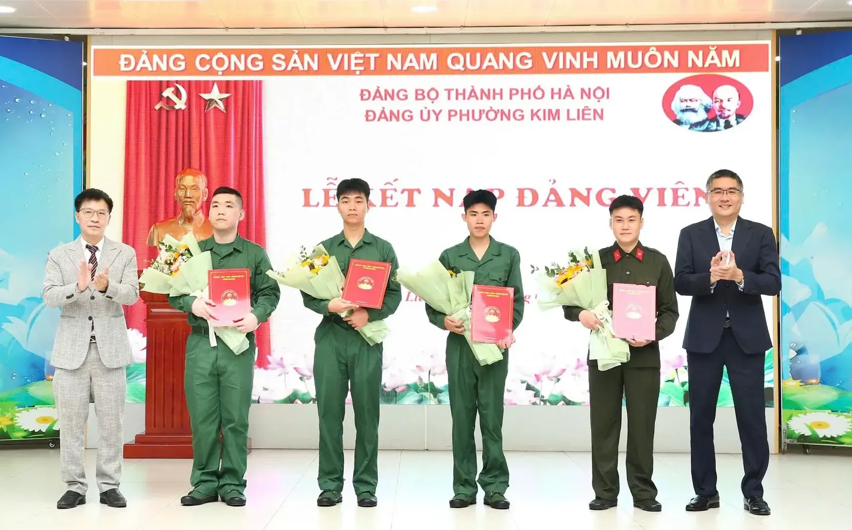 Tại chương trình, Lễ kết nạp đảng viên được tổ chức nghiêm túc, đúng Điều lệ Đảng. Đảng bộ phường Kim Liên đã trao Quyết định kết nạp Đảng cho 4 quần chúng ưu tú chuẩn bị lên đường nhập ngũ, gồm các đồng chí Nguyễn Mạnh Long, Vương Khắc Đạt, Nguyễn Xuân Thành và Phạm Bình Dương.