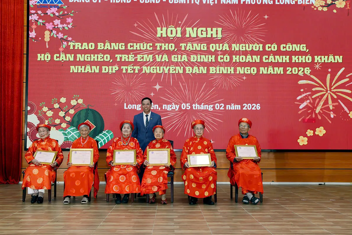 Cũng trong dịp này, phường Long Biên cũng trang trọng tổ chức trao Bằng chúc thọ của Chủ tịch UBND thành phố Hà Nội tặng các cụ tròn 90 tuổi. Năm 2026, toàn phường có 52 cụ vinh dự nhận bằng chúc thọ. Đây là lời tri ân sâu sắc đối với những đóng góp của thế hệ người cao tuổi, mong muốn các cụ luôn sống vui, sống khỏe, là tấm gương sáng cho con cháu noi theo.
