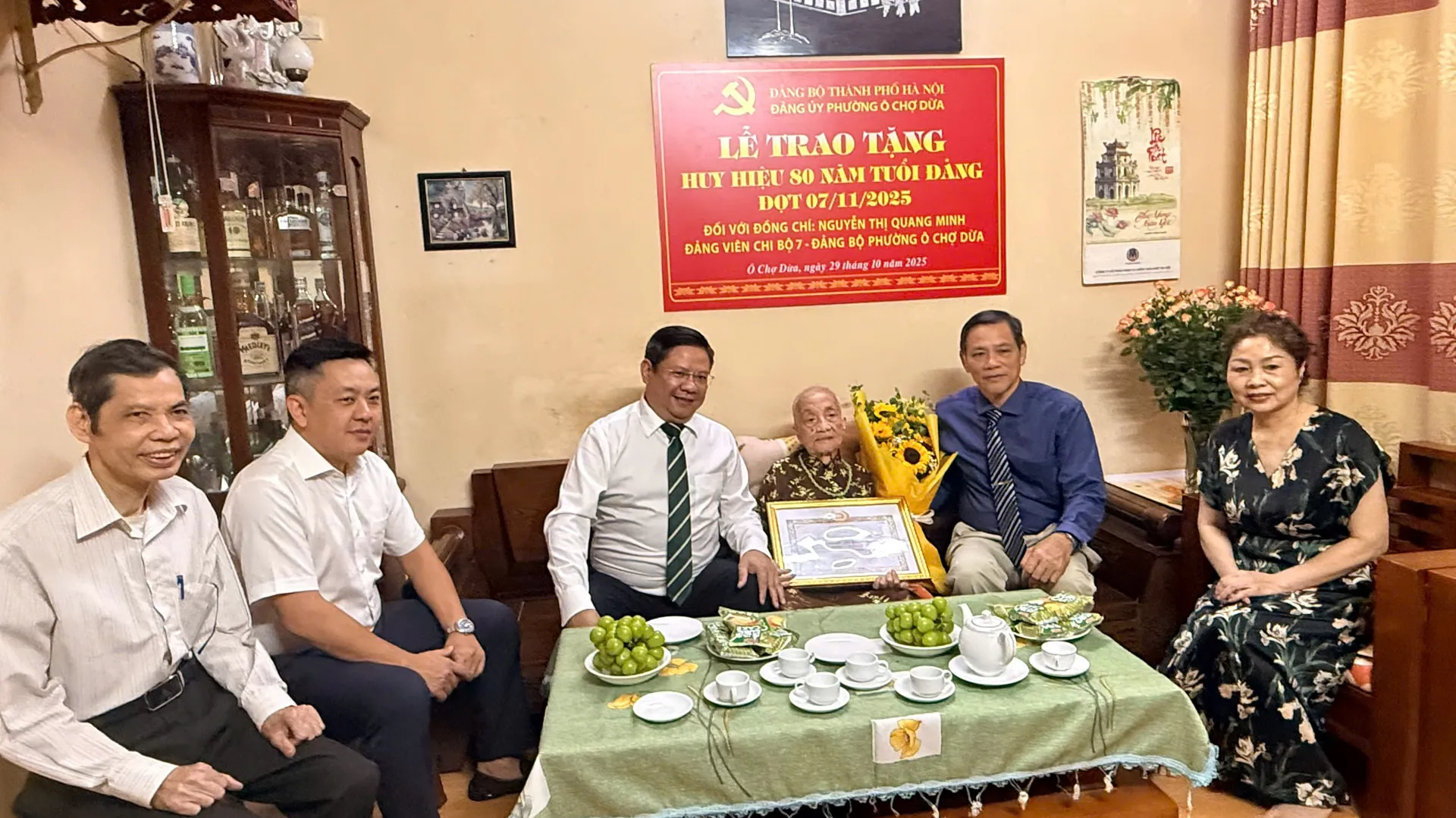 Nhân kỷ niệm 108 năm Cách mạng tháng Mười Nga 7/11/2025, Đảng ủy phường Ô Chợ Dừa trao Huy hiệu Đảng tặng 97 đảng viên. Trong đó, có một đồng chí vinh dự được đón nhận Huy hiệu 80 năm tuổi Đảng nhưng vì lý do sức khỏe nên Đảng ủy phường trao tặng tại nhà riêng.