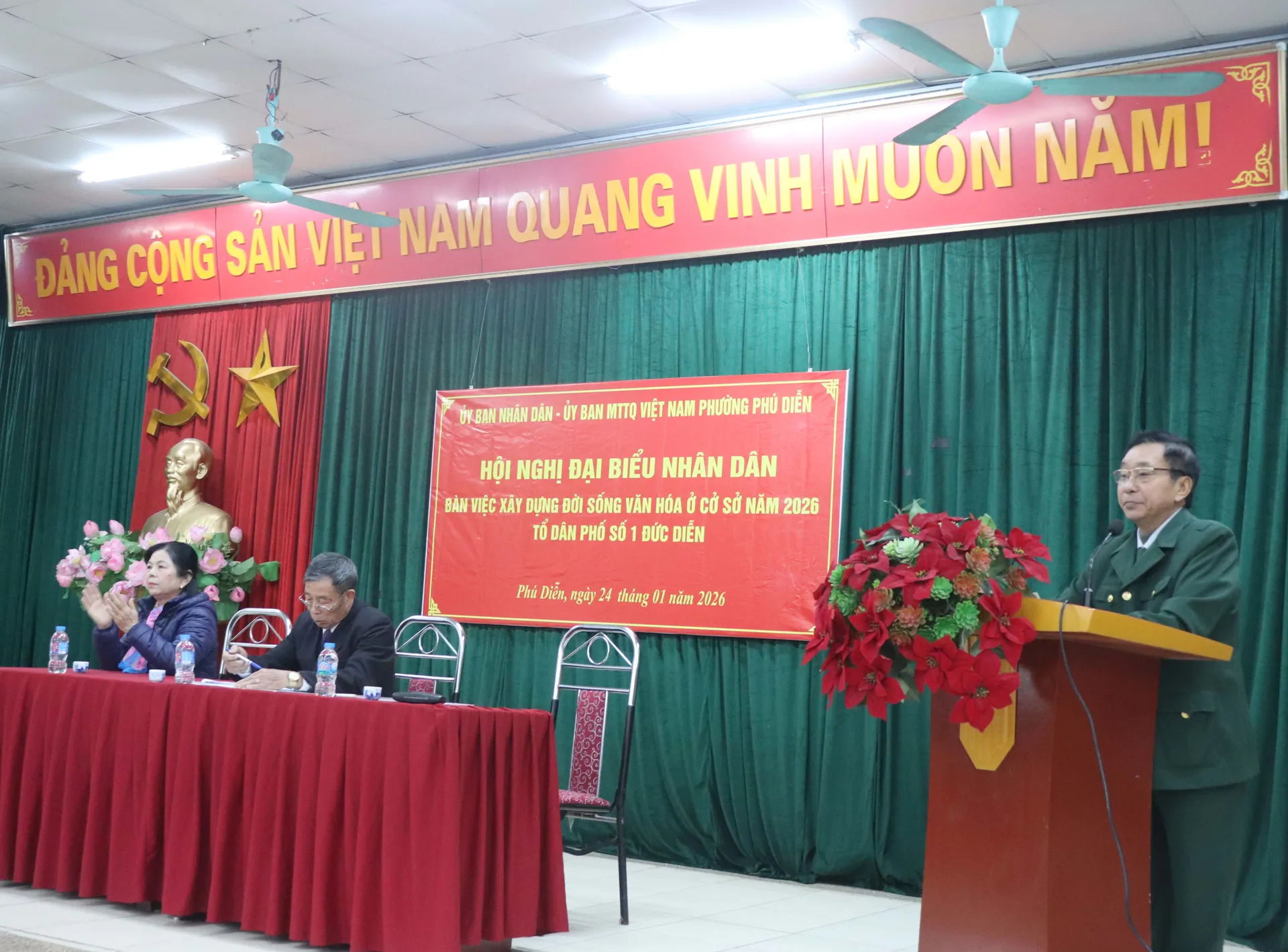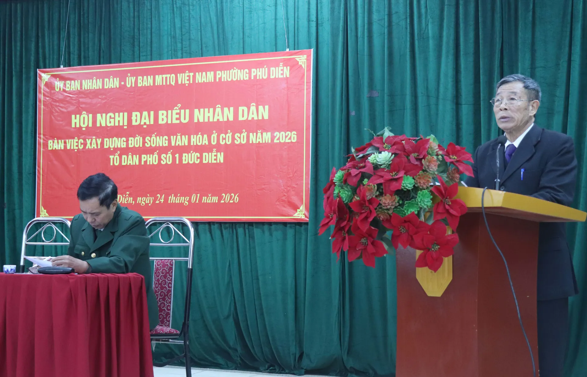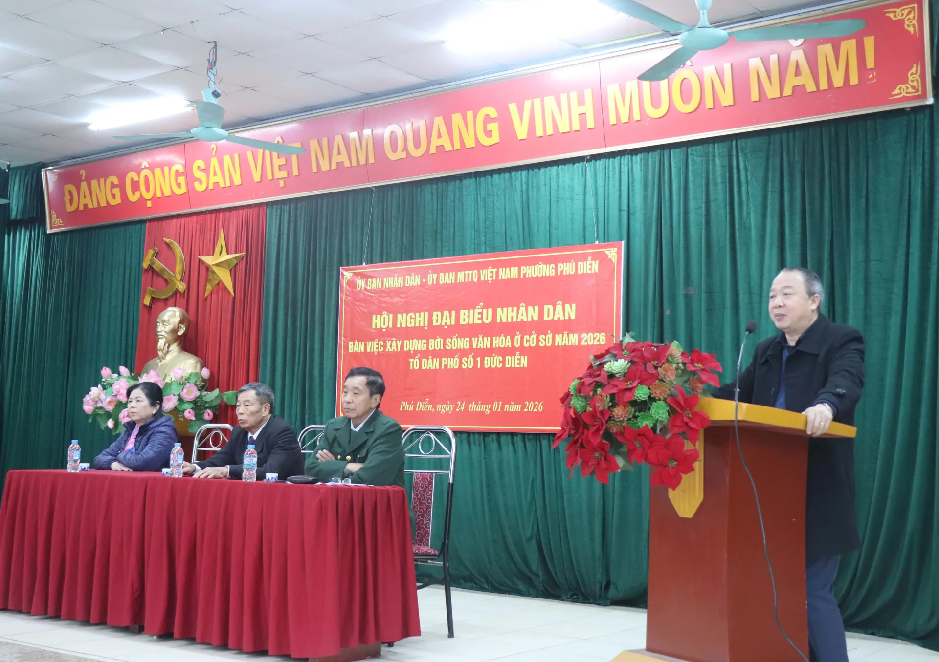 Kinhtedothi – Ngày 24/1, UBND phường Phú Diễn phối hợp Ủy ban MTTQ phường tổ chức Hội nghị đại biểu Nhân dân bàn việc xây dựng đời sống văn hoá ở cơ sở năm 2026 Tổ dân phố (TDP) số 1 Đức Diễn. Tới dự có Bí thư Đảng ủy, Chủ tịch HĐND phường Phú Diễn Nguyễn Lê Hoàng; Chủ tịch Ủy ban MTTQ phường Trần Thị Hồng Hạnh.
