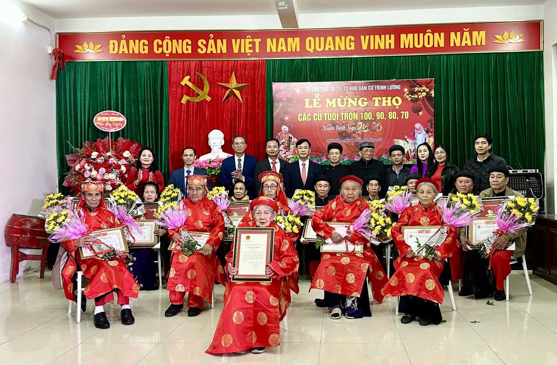 Kinhtedothi - Chiều 8/2, trong không khí ấm áp của những ngày Xuân Bính Ngọ 2026, Đảng ủy – HĐND – UBND – Ủy ban MTTQ Việt Nam phường Phú Lương đã tổ chức Lễ mừng thọ người cao tuổi tại cụm dân cư Trinh Lương, trao thiệp mừng thọ tới các cụ tròn 70, 80, 90 và 100 tuổi trên địa bàn phường.