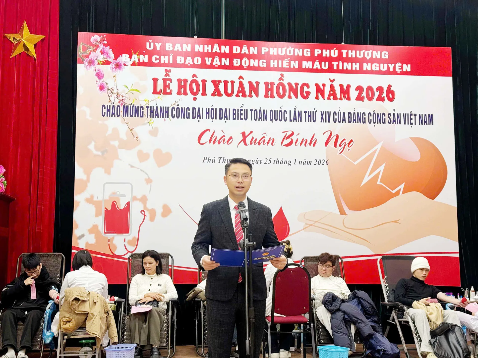 Phát biểu khai mạc ngày hội, Phó Chủ tịch UBND phường Phú Thượng Bùi Thế Cường nhấn mạnh, Lễ hội Xuân Hồng là hoạt động có ý nghĩa nhân văn sâu sắc, là điểm hẹn của lòng nhân ái, nơi mỗi chúng ta cùng chung tay sẻ chia những giọt máu nghĩa tình để cứu sống người bệnh, mang lại hy vọng và niềm tin cho nhiều gia đình. Hiến máu tình nguyện không chỉ là hành động cao đẹp, còn là trách nhiệm, tình cảm, biểu hiện sinh động của truyền thống đoàn kết, nhân ái “Thương người như thể thương thân” của dân tộc Việt Nam.