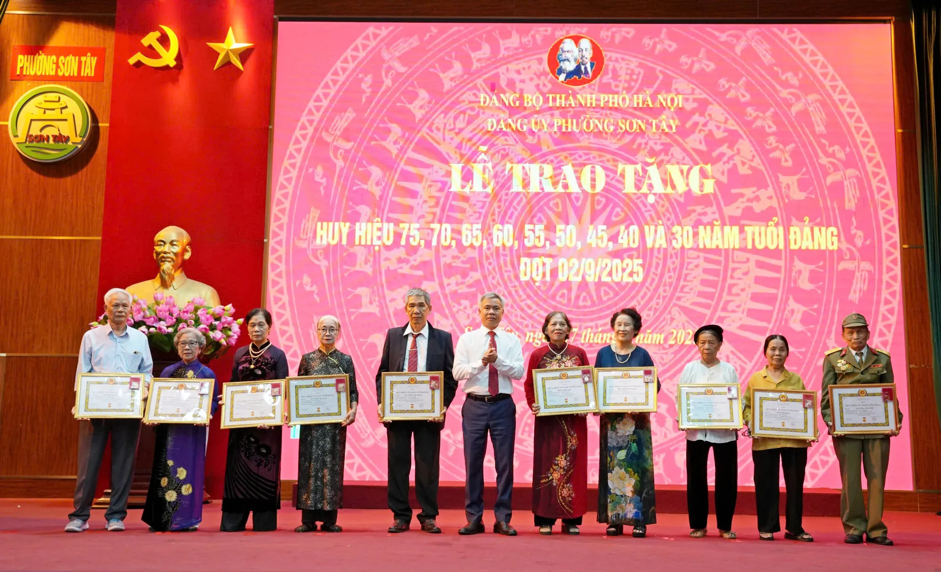 Được biết trong đợt trao Huy hiệu Đảng 2/9 năm nay, Đảng bộ phường Sơn Tây vinh dự có 123 đảng viên được nhận Huy hiệu Đảng, trong đó có 1 đồng chí được tặng Huy hiệu 75 năm tuổi Đảng, 2 đồng chí được tặng Huy hiệu 70 năm tuổi Đảng và 120 đồng chí được tặng Huy hiệu từ 30 năm đến 65 năm tuổi Đảng.