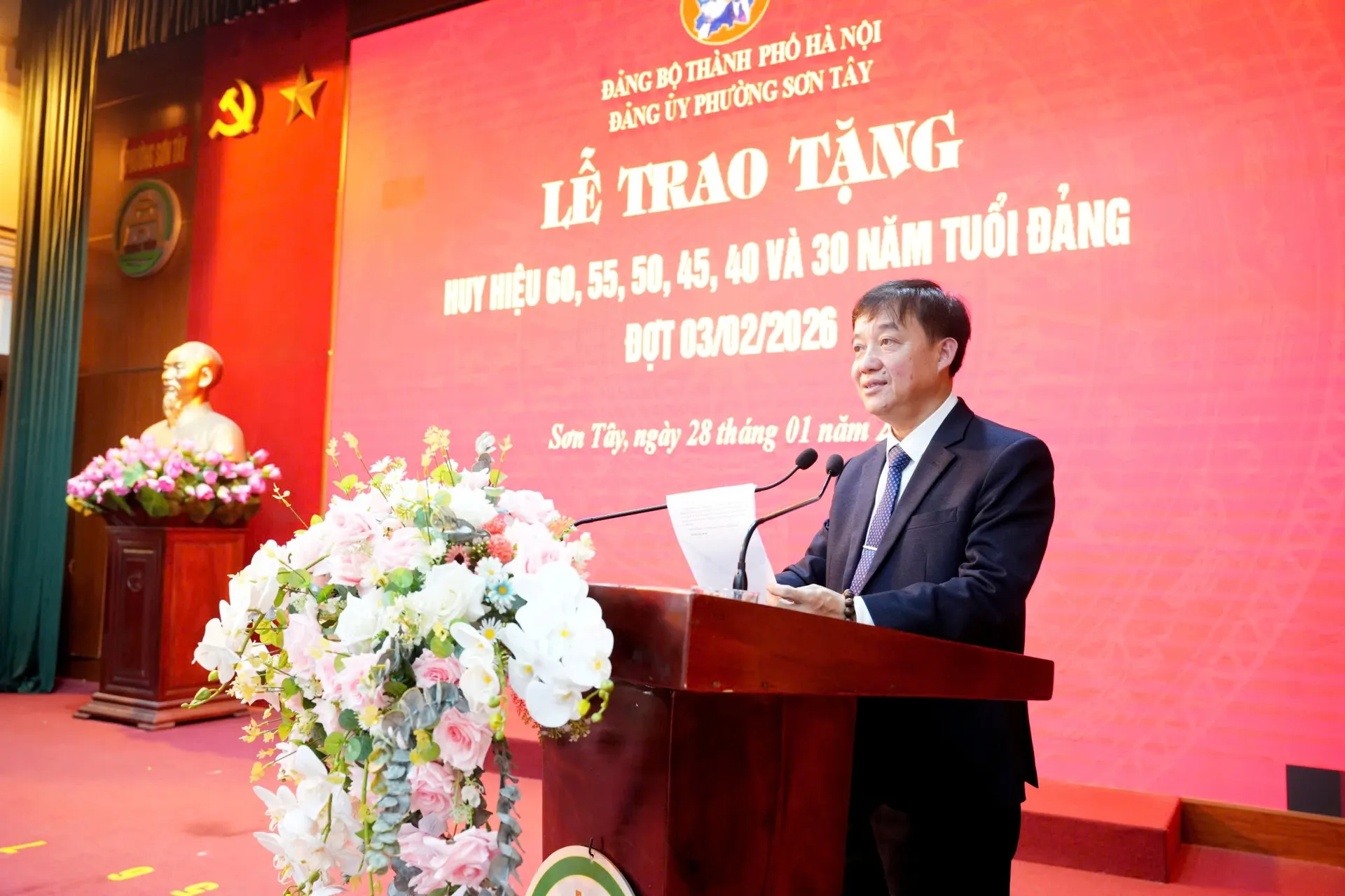 Phát biểu tại buổi lễ, Phó Bí thư Thường trực Đảng ủy phường Sơn Tây Lê Đại Thăng nhấn mạnh: Các đồng chí được nhận Huy hiệu Đảng đợt 3/2 là niềm vinh dự, tự hào của mỗi đảng viên, gia đình, người thân và toàn Đảng bộ, nhân dân phường Sơn Tây. Đây cũng là dịp để Đảng bộ, chính quyền và nhân dân phường bày tỏ lòng tri ân sâu sắc tới các thế hệ đảng viên đã kiên trung, bền bỉ cống hiến cho sự nghiệp cách mạng của Đảng và dân tộc.
