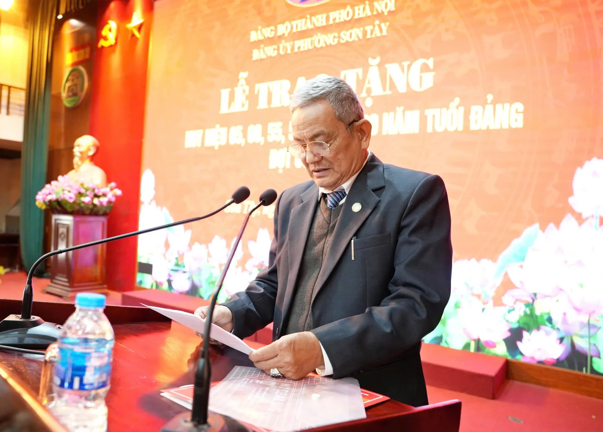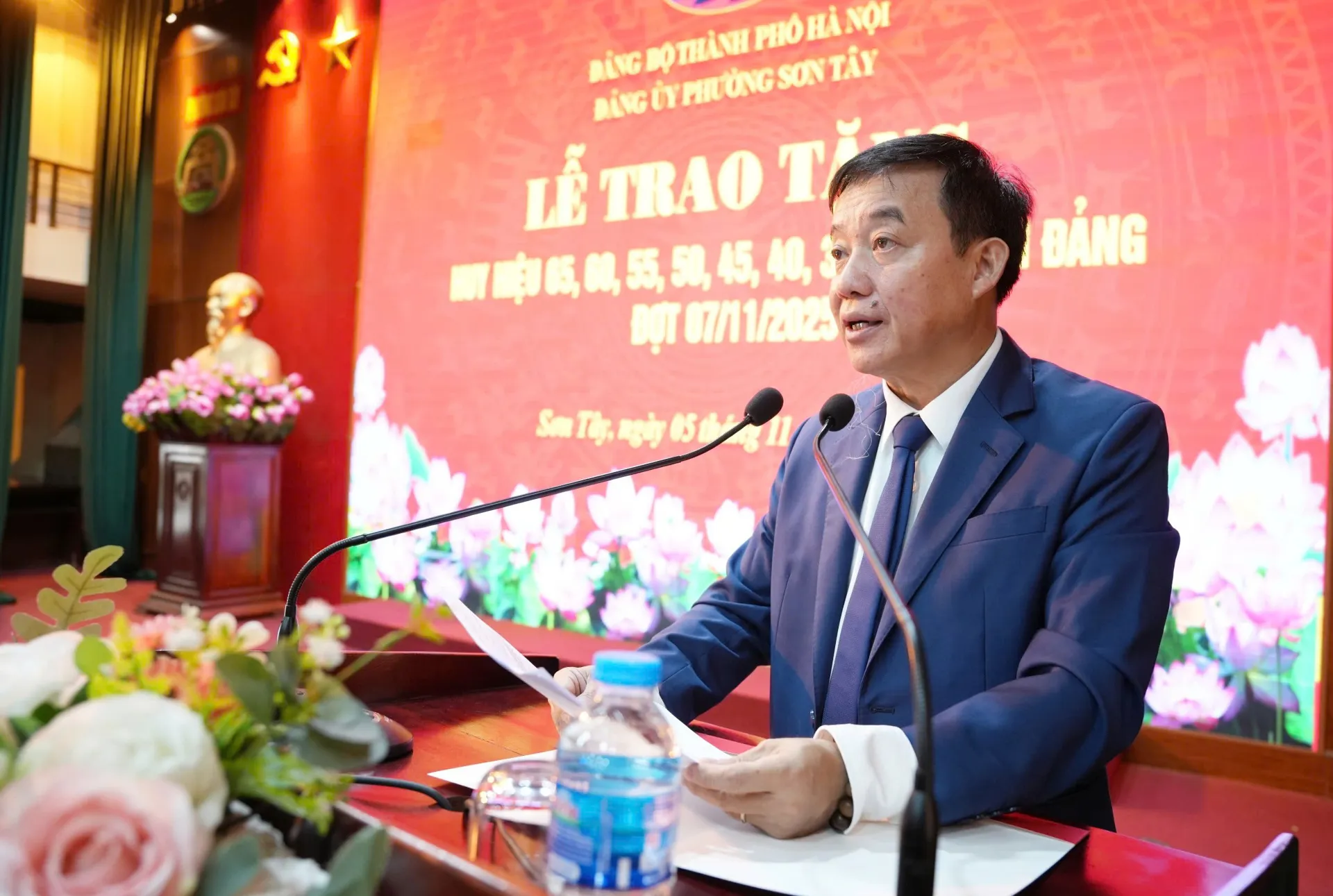 Phát biểu tại buổi lễ, Phó Bí thư Thường trực Đảng ủy phường Sơn Tây Lê Đại Thăng nhấn mạnh, các đồng chí được nhận Huy hiệu Đảng đợt 7/11 là niềm vinh dự, tự hào của mỗi đảng viên, gia đình, người thân và toàn Đảng bộ, nhân dân phường Sơn Tây. Đây cũng là dịp để Đảng bộ, chính quyền và nhân dân phường bày tỏ lòng tri ân sâu sắc tới các thế hệ đảng viên đã kiên trung, bền bỉ cống hiến cho sự nghiệp cách mạng của Đảng và dân tộc.