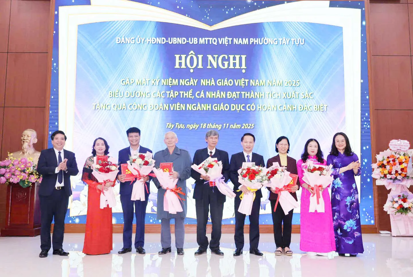 Lãnh đạo phường Tây Tựu tặng hoa chúc mừng các nhà giáo.