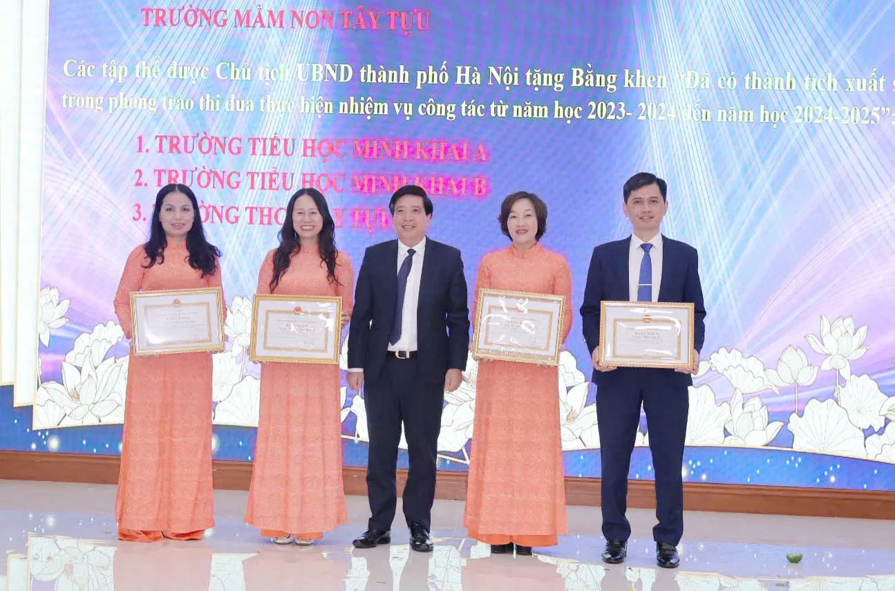 Thời gian qua, 13/13 trường học trên địa bàn phường đã có nhiều nỗ lực, quyết tâm đổi mới, nâng cao chất lượng giáo dục toàn diện. 4 tập thể được nhận Bằng khen của UBND TP, 6 tập thể nhận cờ thi đua, 2 tập thể nhận Giấy khen với những thành tích xuất sắc trong công tác chuyên môn; 24 cá nhân được tặng danh hiệu Chiến sĩ thi đua, Bằng khen, Giấy khen, sáng kiến kinh nghiệm cấp TP và nhiều thành tích khác. Nhân dịp này, phường Tây Tựu cũng đã tặng quà cho 21 công đoàn viên ngành giáo dục có hoàn cảnh đặc biệt.