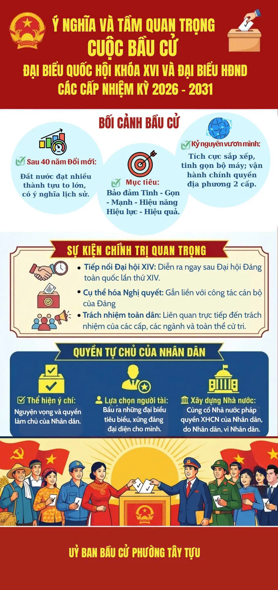 Với thông điệp: “Mỗi lá phiếu - Một niềm tin”; “Tham gia đầy đủ - Lựa chọn sáng suốt”, từ ngày 3/2 - 16/3/2026, mỗi ngày sẽ có một bản tin tuyên truyền dưới dạng 1 infographic, mỗi tuần 2 video được đăng tải trên các nền tảng mạng xã hội của phường như: trang fanpage phường; Zalo OA phường; nhóm Zalo tổ dân phố, cộng đồng dân cư; hệ thống phát thanh.