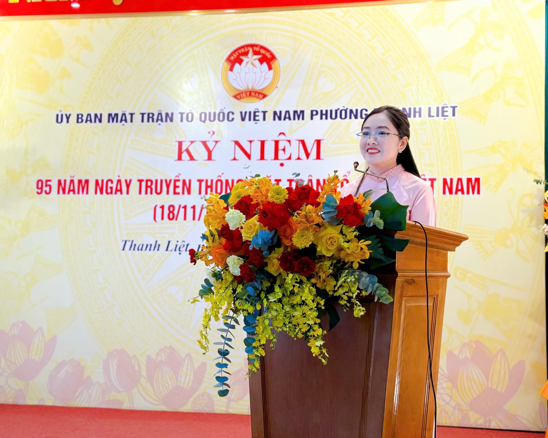 Trong diễn văn kỷ niệm, Uỷ viên BTV Đảng uỷ, Chủ tịch Uỷ ban MTTQ Việt Nam phường Tạ Thu Sa cho biết: “Năm 2025 – năm đầu tiên thực hiện mô hình chính quyền 2 cấp – MTTQ phường Thanh Liệt đã đổi mới mạnh mẽ nội dung, phương thức hoạt động; bám sát nhiệm vụ chính trị và hướng dẫn của Ủy ban MTTQ thành phố, triển khai nhiều phong trào thi đua, cuộc vận động thiết thực. MTTQ phường đã vận động các nguồn lực xã hội hóa hơn 5 tỷ đồng để thực hiện 26 công trình, phần việc chào mừng các sự kiện lớn; duy trì 46 câu lạc bộ với trên 1.600 thành viên; đăng tải 138 tin, bài tuyên truyền trên các nền tảng số và phương tiện truyền thông.