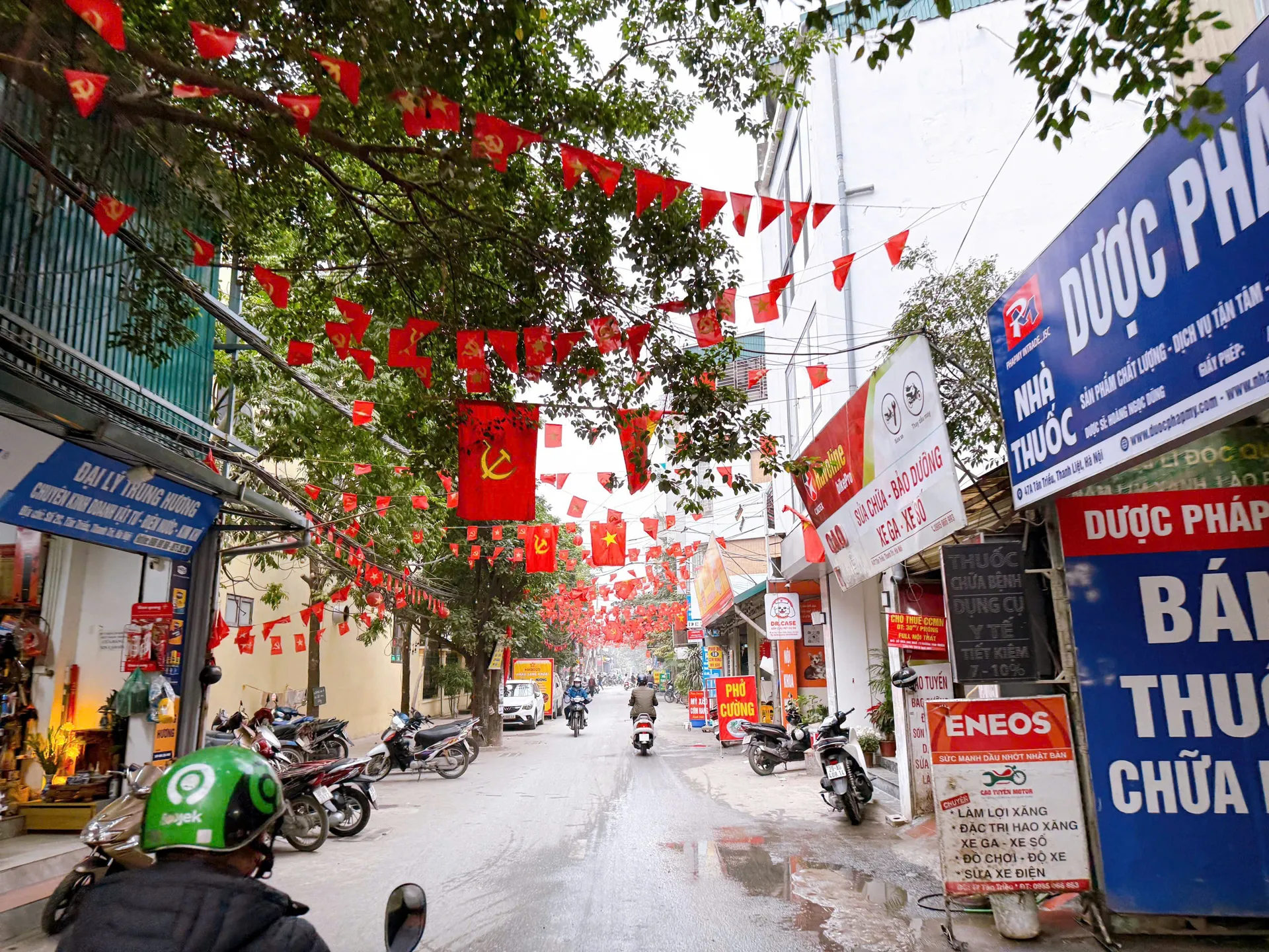 Trụ sở Đảng ủy phường Thanh Liệt được trang trí cờ, băng rôn, khẩu hiệu rực rỡ.