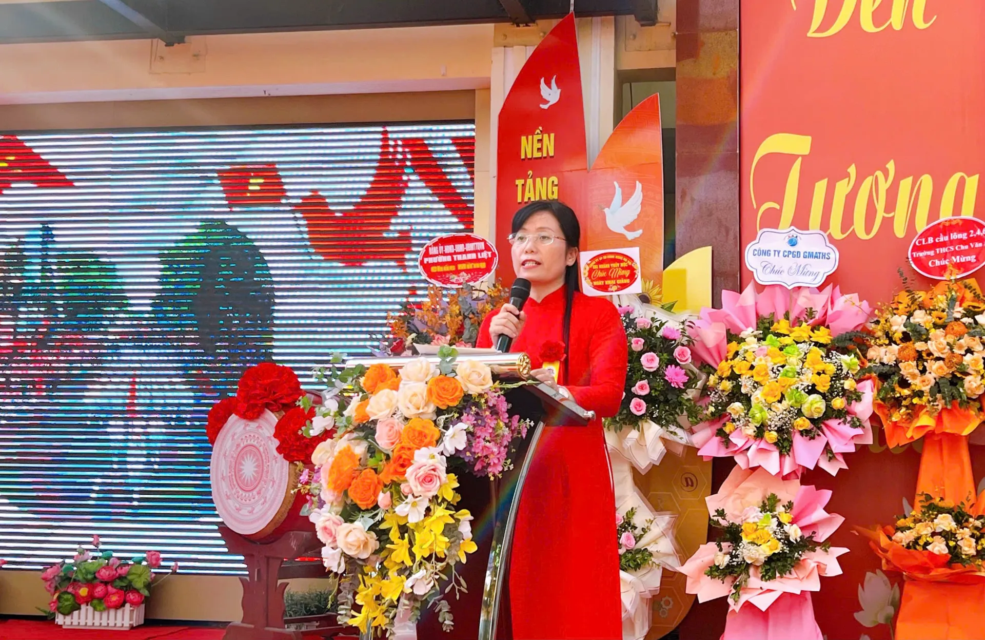 Bí thư Đảng ủy, Chủ tịch HĐND phường Thanh Liệt Nguyễn Minh Tuân tặng hoa chúc mừng Trường THCS Chu Văn An.