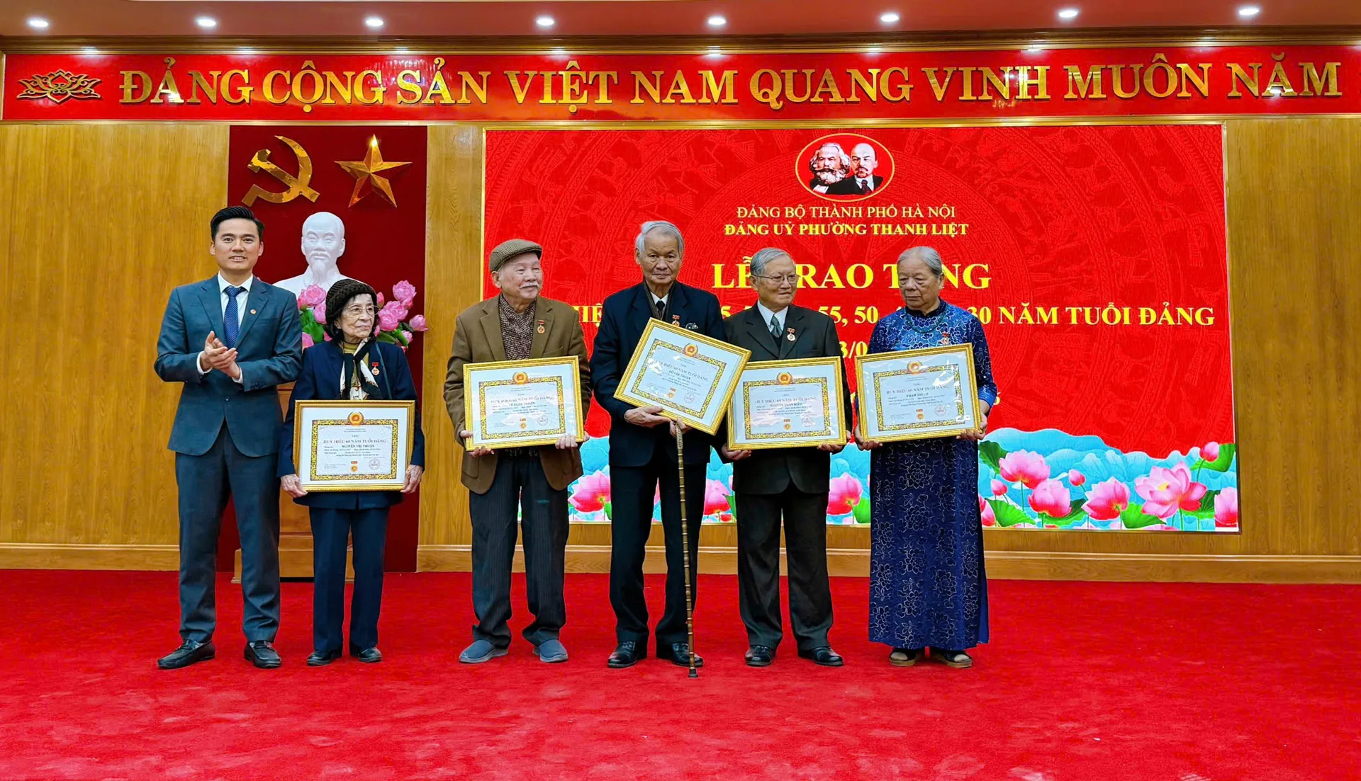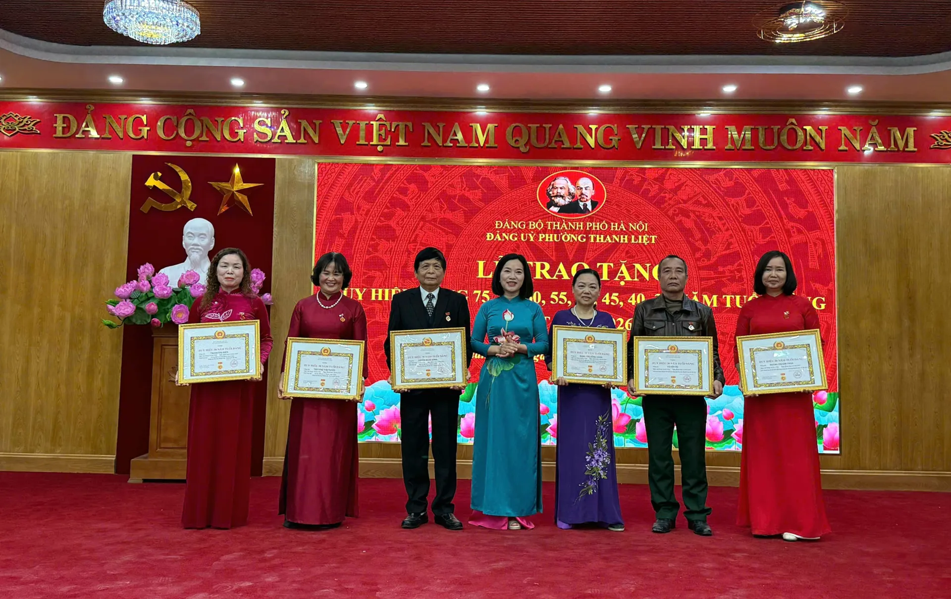 Trong khuôn khổ buổi lễ, Đảng ủy phường Thanh Liệt đã trang trọng tổ chức trao Huy hiệu Đảng đợt 03/02/2026 cho 74 đảng viên, trong đó có 01 đảng viên được trao Huy hiệu 75 năm tuổi Đảng, 01 đảng viên được trao Huy hiệu 70 năm tuổi Đảng. Đây là sự ghi nhận, trân trọng của Đảng đối với quá trình cống hiến bền bỉ, sự trung thành tuyệt đối với lý tưởng cách mạng của các đảng viên qua nhiều giai đoạn lịch sử.