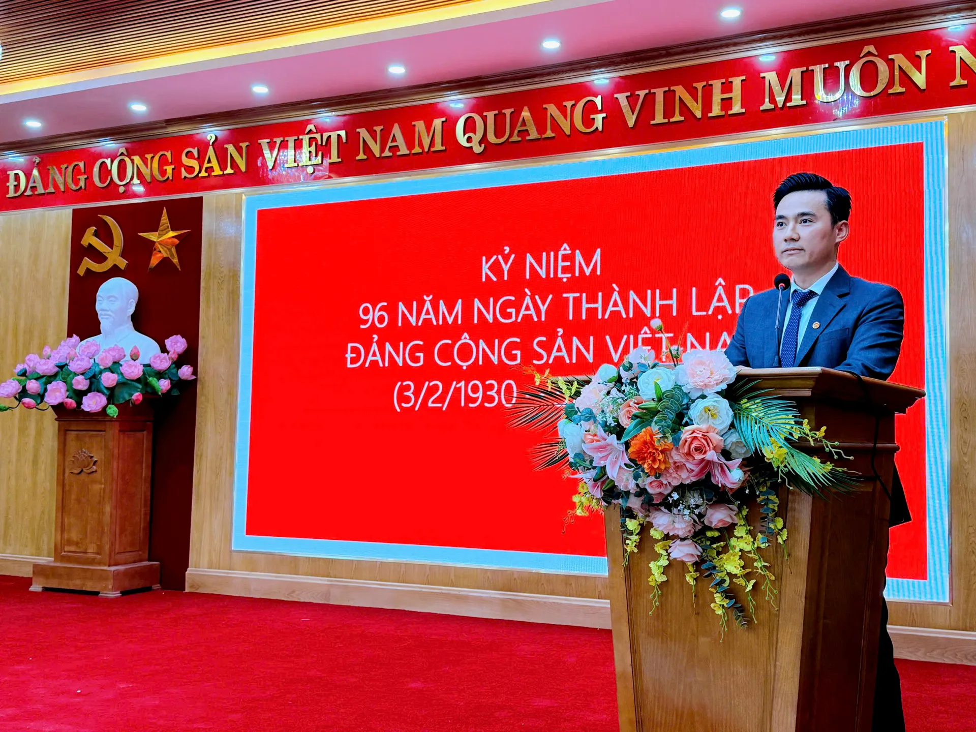 Phó Bí thư Thường trực Đảng ủy phường Thanh Liệt Lý Duy Xuân trình bày diễn văn kỷ niệm 96 năm Ngày thành lập Đảng Cộng sản Việt Nam.