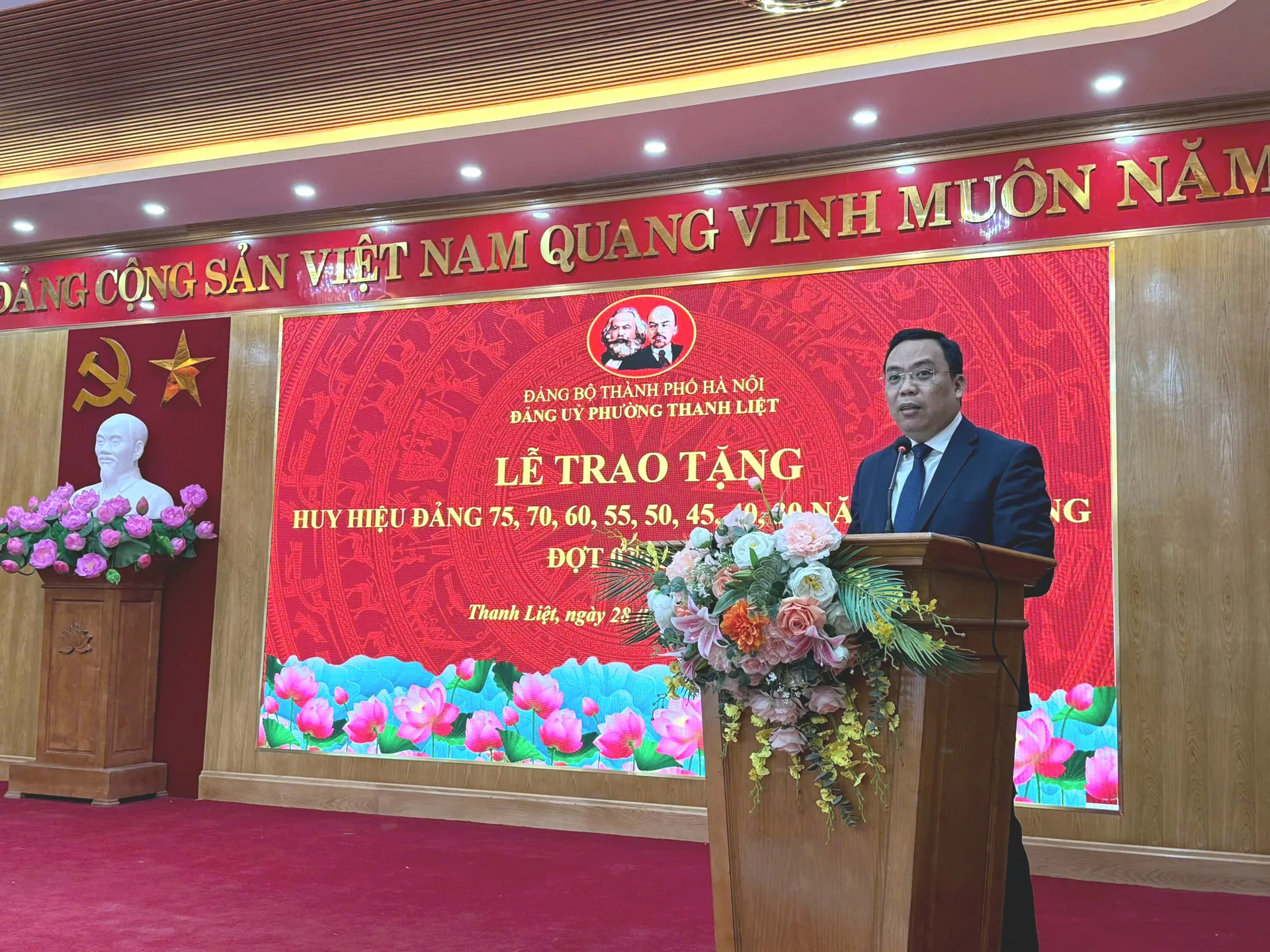 Phát biểu tại buổi lễ, đồng chí Nguyễn Minh Tuân – Bí thư Đảng ủy phường Thanh Liệt đã chúc mừng và bày tỏ lòng tri ân sâu sắc đối với các đồng chí đảng viên được nhận Huy hiệu Đảng. Đồng chí khẳng định, mỗi Huy hiệu Đảng là biểu tượng cao quý của niềm tin, ý chí, bản lĩnh chính trị và tinh thần hy sinh, cống hiến không mệt mỏi của người đảng viên Cộng sản Việt Nam. Đồng chí mong muốn các đảng viên lão thành tiếp tục phát huy vai trò gương mẫu, đóng góp trí tuệ, kinh nghiệm, là chỗ dựa tinh thần vững chắc cho các thế hệ cán bộ, đảng viên trẻ.