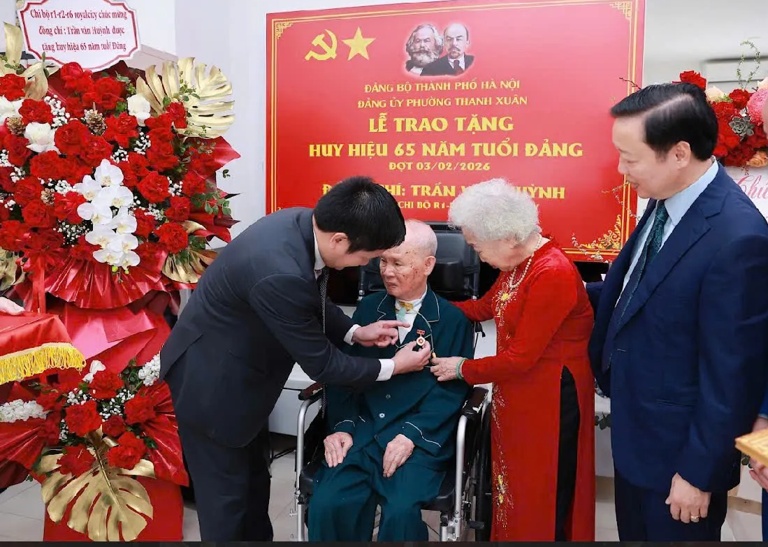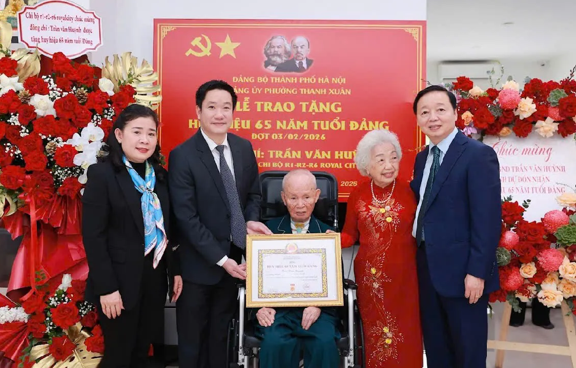 Kinhtedothi - Trong không khí phấn khởi của toàn Đảng, toàn dân chào mừng kỷ niệm 96 năm Ngày thành lập Đảng Cộng sản Việt Nam (03/02/1930 - 03/02/2026), ngày 29/1, Đảng ủy phường Thanh Xuân đã tổ chức Lễ trao tặng Huy hiệu Đảng tại nhà cho GS.TS.NGND Trần Văn Huỳnh - Đảng viên Chi bộ R1,2,6 Royal City.