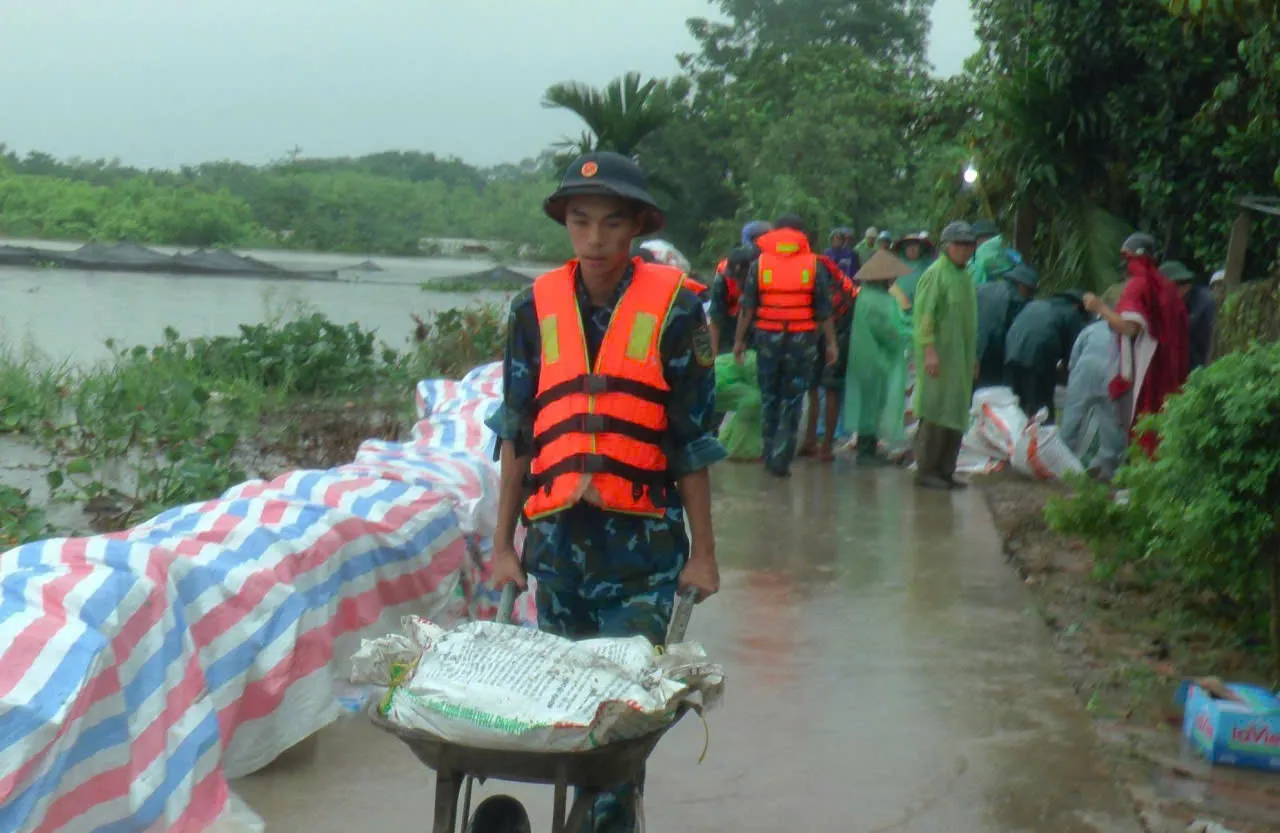 Mọi người chung tay gia cố đê điều, phòng chống lũ trên sông Tích.