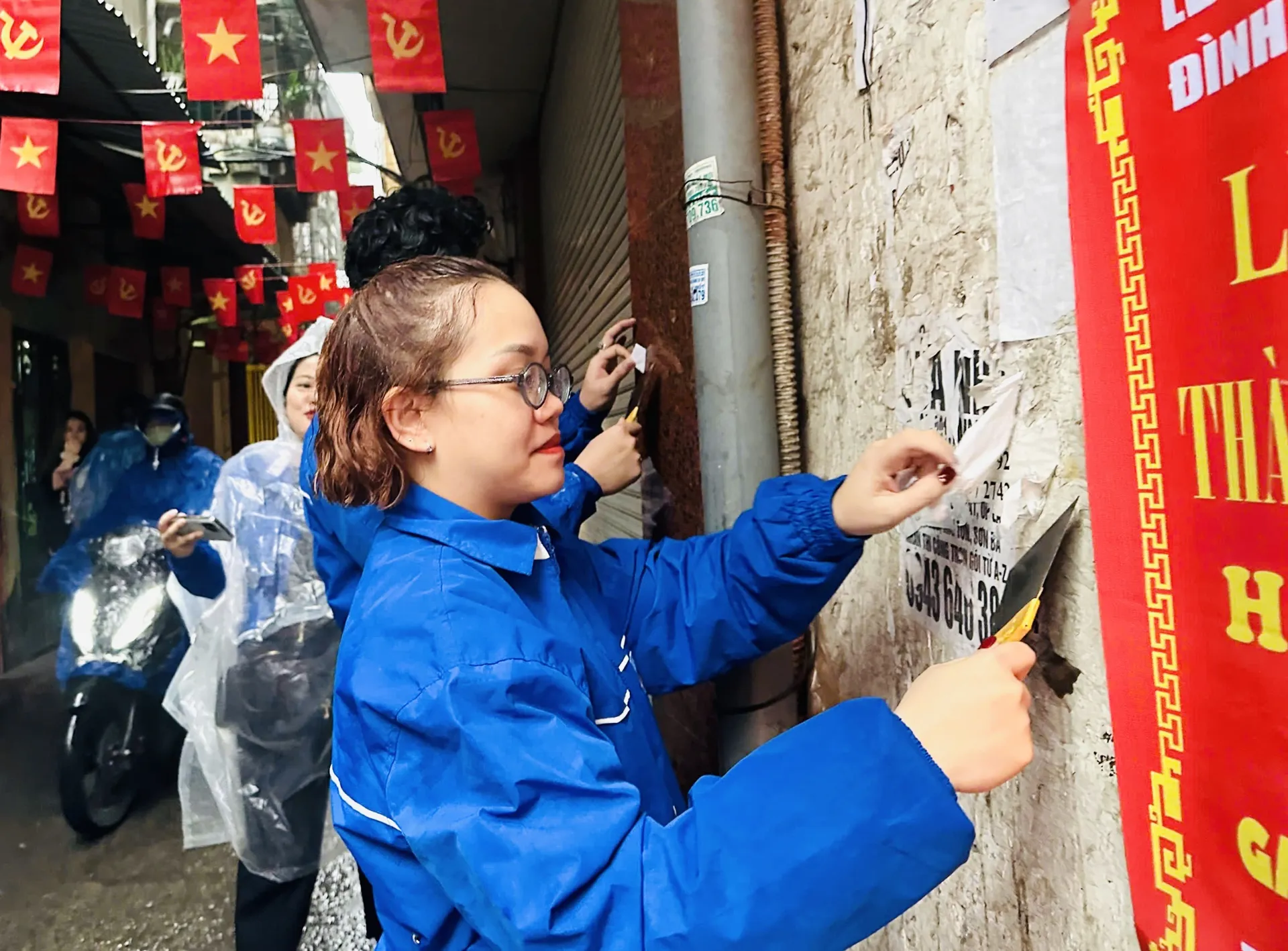 Các lực lượng chức năng phường Văn Miếu – Quốc Tử Giám bóc xoá các quảng cáo rao vặt trên các tuyến phố.