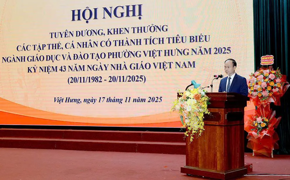 Kinhtedothi- Nhân kỷ niệm 43 năm Ngày Nhà giáo Việt Nam (20/11/1982 – 20/11/2025), chiều 17/11, Đảng uỷ – HĐND – UBND – Ủy ban MTTQ phường Việt Hưng đã long trọng tổ chức Hội nghị tuyên dương, khen thưởng các tập thể, cá nhân tiêu biểu ngành giáo dục và đào tạo. Đây là dịp tri ân sâu sắc công lao của các thế hệ thầy cô giáo, đồng thời lan tỏa truyền thống “tôn sư trọng đạo” tốt đẹp của dân tộc trên địa bàn phường.