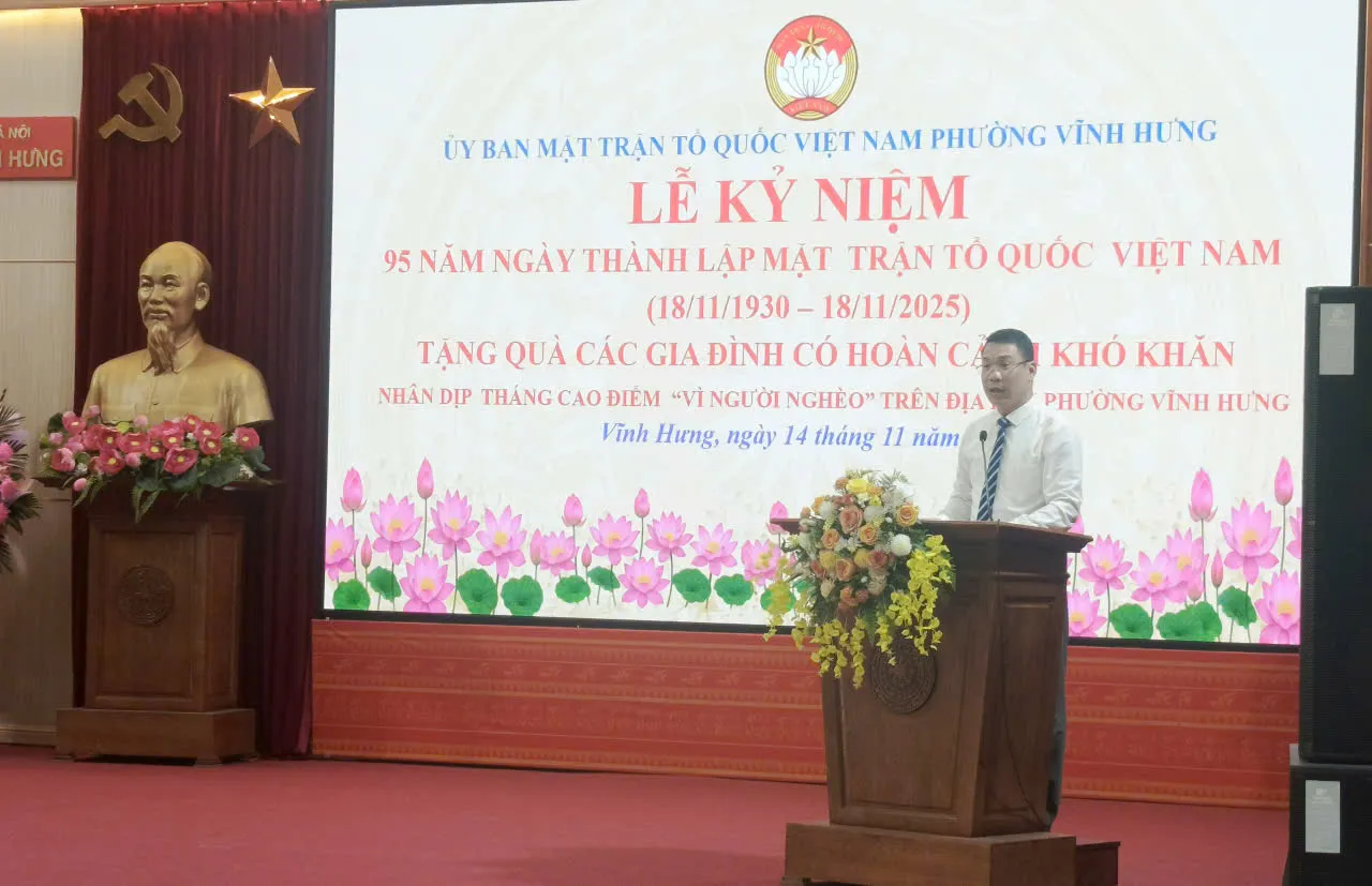 Chủ tịch Ủy ban MTTQ Việt Nam phường Phạm Ngọc Hưng ôn lại chặng đường 95 năm vẻ vang của Mặt trận Tổ quốc Việt Nam – biểu tượng sáng ngời của khối đại đoàn kết toàn dân tộc. Phát huy truyền thống đó, Ủy ban MTTQ Việt Nam phường Vĩnh Hưng đã không ngừng đổi mới, nâng cao hiệu quả công tác vận động nhân dân, chăm lo an sinh xã hội, xây dựng đời sống văn hóa ở khu dân cư.