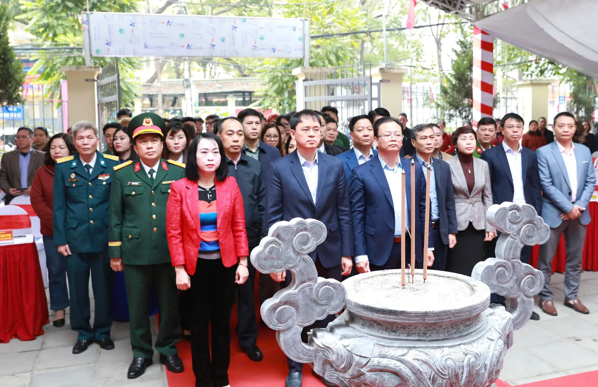 Bí thư Đảng ủy, Chủ tịch HĐND phường Vĩnh Tuy Nguyễn Quang Trung và các đại biểu, bà con Nhân dân, công dân nhập ngũ năm 2026 dâng hương tại Nhà bia tưởng niệm các liệt sỹ trên địa bàn phường