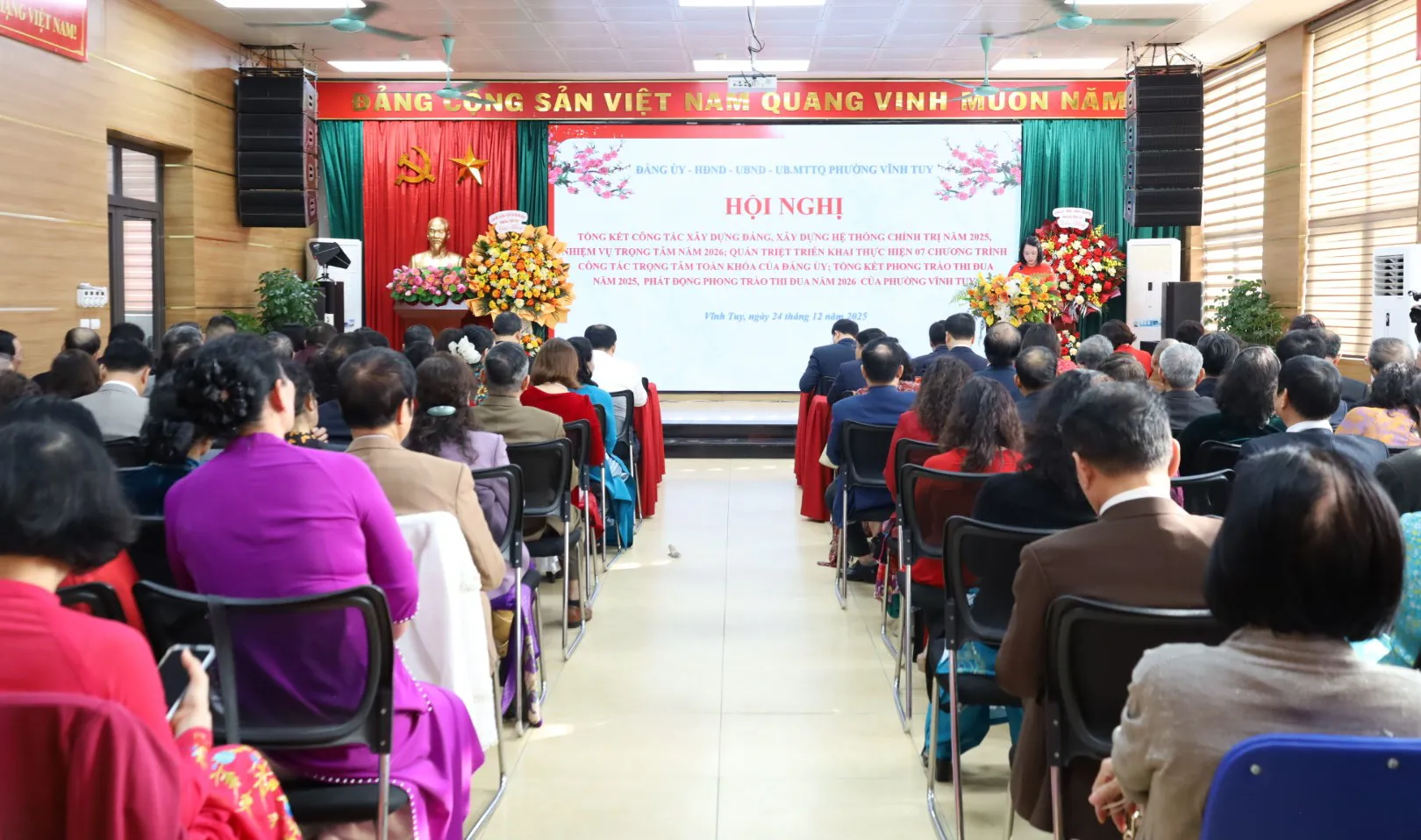 Hôm nay, 24/12, Đảng ủy, HĐND, UBND, UB MTTQ phường Vĩnh Tuy trang trọng tổ chức Hội nghị tổng kết công tác xây dựng Đảng, xây dựng hệ thống chính trị năm 2025 và triển khai nhiệm vụ trọng tâm năm 2026; quán triệt triển khai thực hiện 7 Chương trình công tác trọng tâm toàn khóa của Đảng ủy phường; tổng kết phong trào thi đua năm 2025, phát động phong trào thi đua năm 2026.