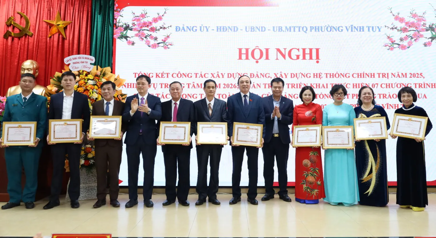 Với những kết quả đạt được năm 2025, nhiều tập thể và cá nhân phường Vĩnh Tuy đã được T.Ư, TP Hà Nội khen thưởng: Đảng bộ và Nhân dân phường được đề nghị tặng “Bằng khen của Chủ tịch UBND TP”, 1 cá nhân được đề nghị tặng Bằng khen của Thủ tướng Chính phủ, 2 tập thể được đề nghị tặng Cờ thi đua của TP, 7 cá nhân được tặng Bằng khen Chủ tịch UBND TP...