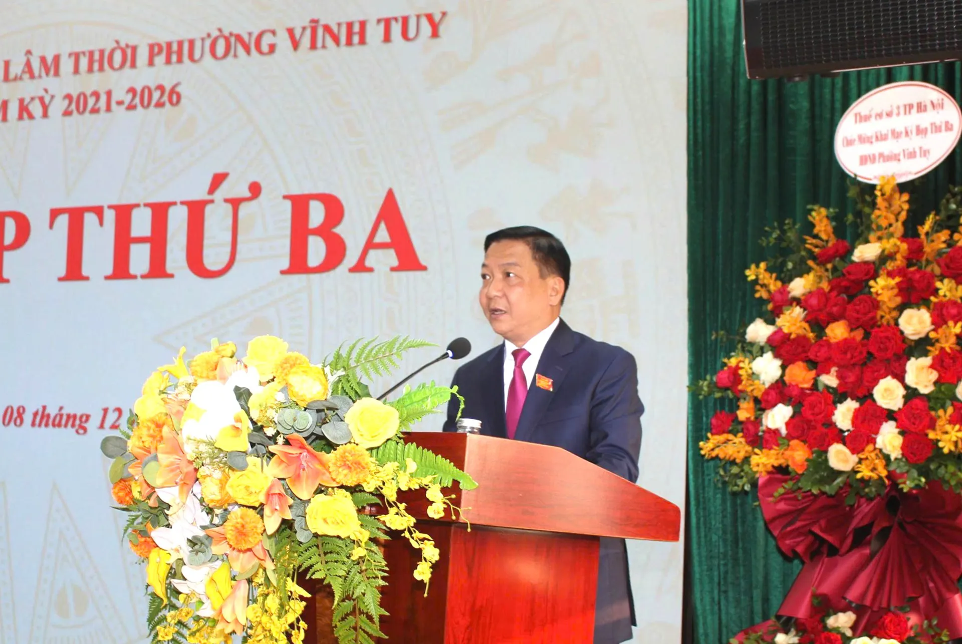 Bí thư Đảng ủy, Chủ tịch HĐND phường Vĩnh Tuy Nguyễn Quang Trung phát biểu khai mạc Kỳ họp