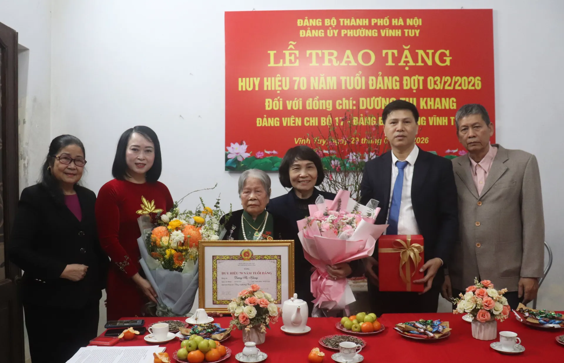 Trân trọng trao tặng Huy hiệu Đảng và ân cần hỏi thăm sức khỏe đảng viên lão thành Dương Thị Khang cùng gia đình, Phó Bí thư Thường trực Đảng ủy phường Vĩnh Tuy khẳng định, việc trao tặng Huy hiệu 70 năm tuổi Đảng là niềm vinh dự to lớn không chỉ với cá nhân, gia đình đồng chí mà còn là niềm vinh dự của Đảng bộ TP Hà Nội, Đảng bộ và Nhân dân phường Vĩnh Tuy, là sự ghi nhận xứng đáng của Đảng đối với quá trình rèn luyện, cống hiến liên tục, bền bỉ của đồng chí.