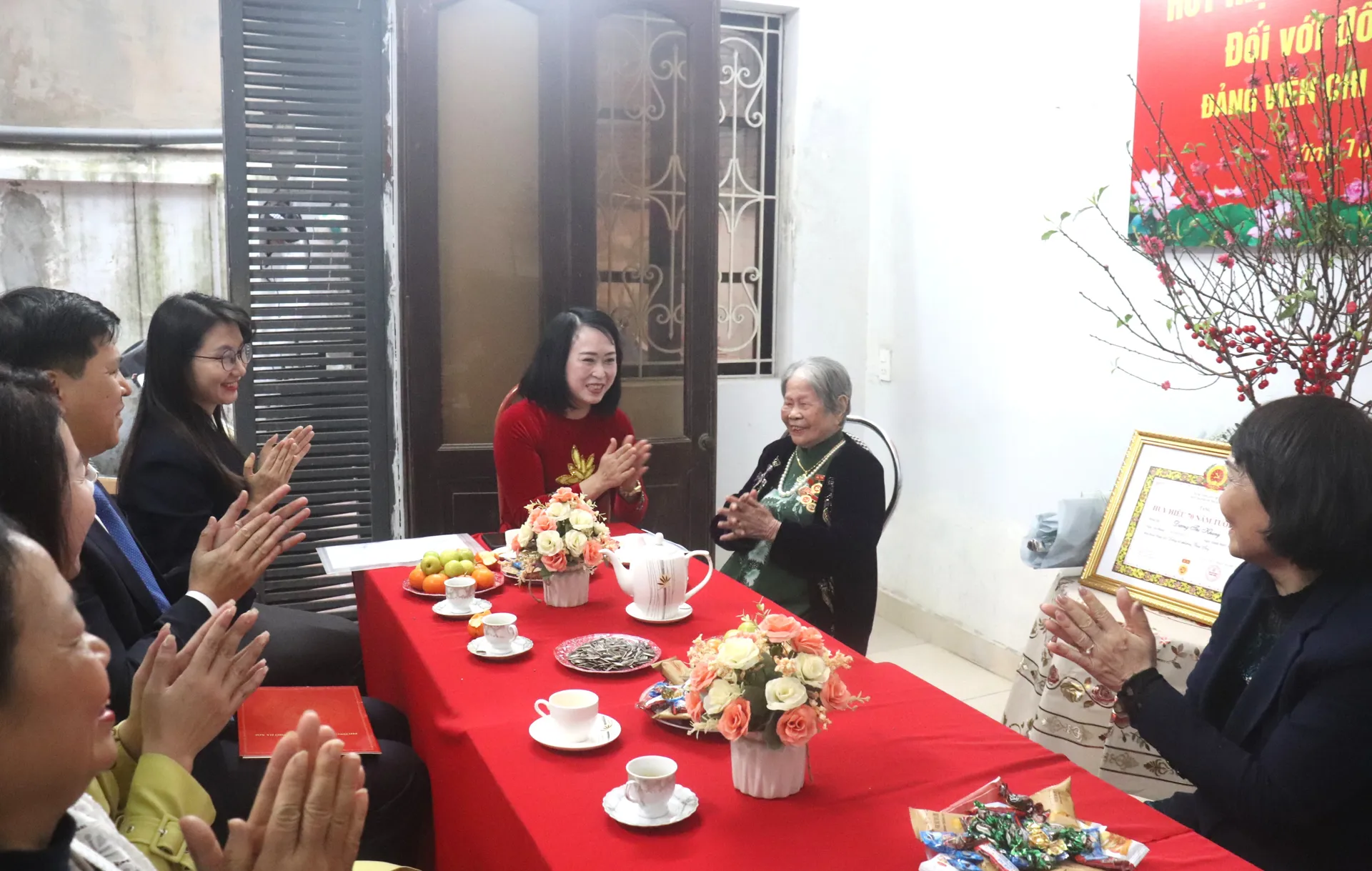 Thay mặt Ban Thường vụ Thành ủy và Ban Thường vụ Đảng ủy phường, đồng chí Phùng Bích Nga kính chúc đảng viên Dương Thị Khang luôn mạnh khỏe, mãi là tấm gương sáng cho con cháu và các thế hệ cán bộ, đảng viên noi theo; gia đình đón năm mới Bính Ngọ 2026 an lành, may mắn.