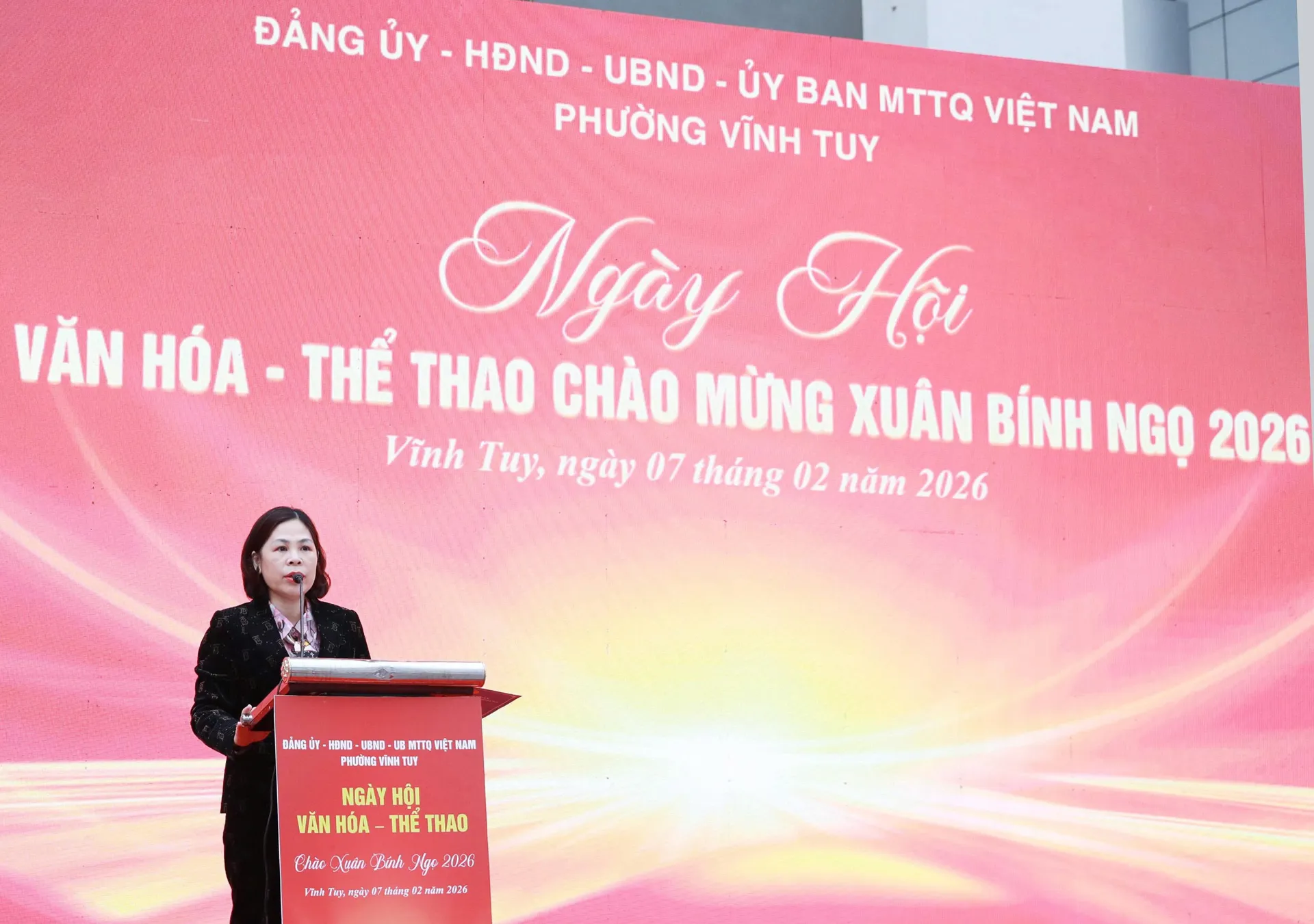 Phó Chủ tịch UBND phường Vĩnh Tuy Lê Bích Hằng phát biểu khai mạc Hội chợ Xuân và Ngày hội văn hóa - thể thao chào mừng Xuân Bính Ngọ 2026