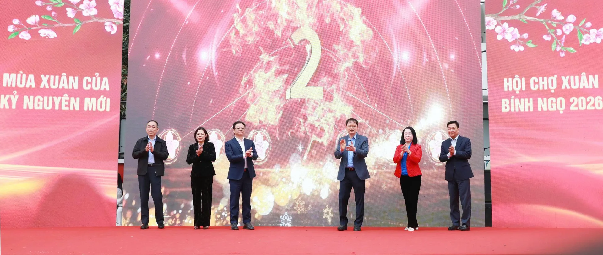 Bí thư Đảng ủy, Chủ tịch HĐND phường Vĩnh Tuy Nguyễn Quang Trung và các đồng chí lãnh đạo Đảng ủy, HĐND, UBND phường thực hiện nghi thức bấm nút khai mạc Hội chợ Xuân Bính Ngọ 2026