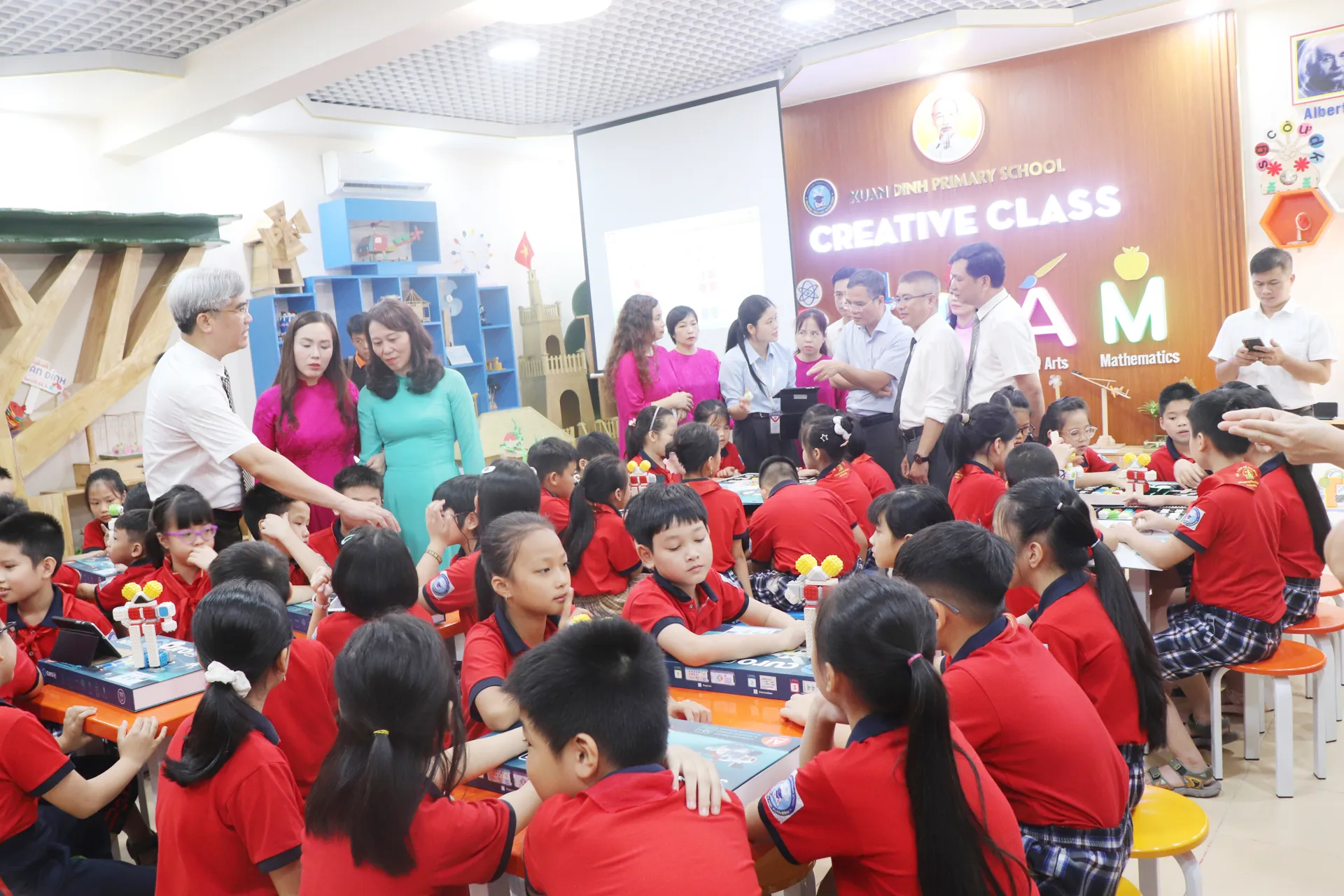 Đại diện Sở GD&ĐT Hà Nội, lãnh đạo phường Xuân Đỉnh và Trường Tiểu học Xuân Đỉnh tham quan tại phòng STEM.