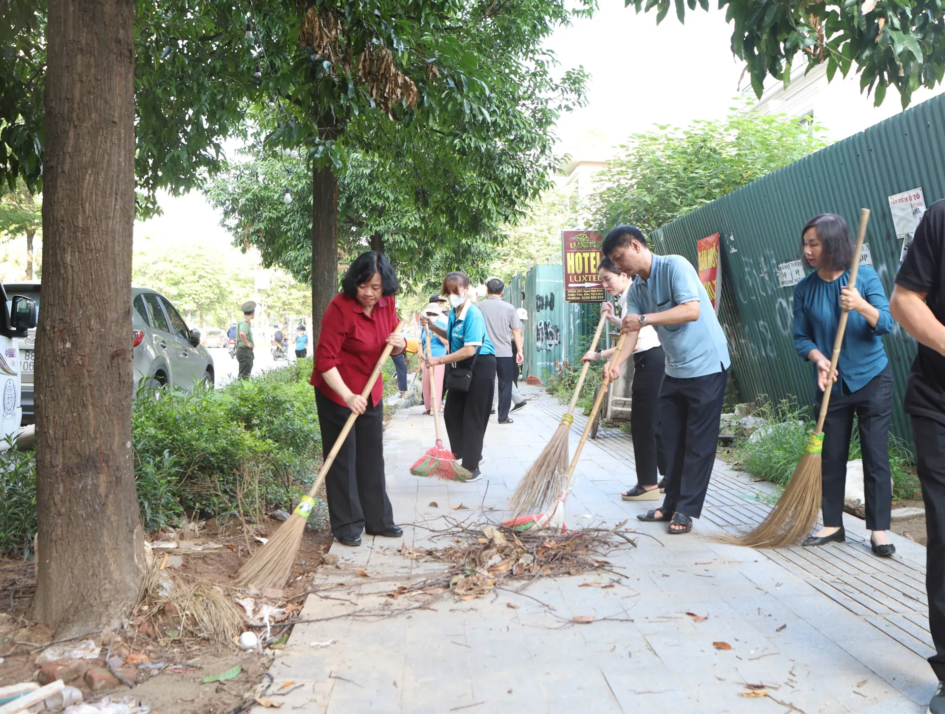 Bí thư Thành ủy Hà Nội Bùi Thị Minh Hoài cùng người dân Xuân Đỉnh làm sạch đường phố.