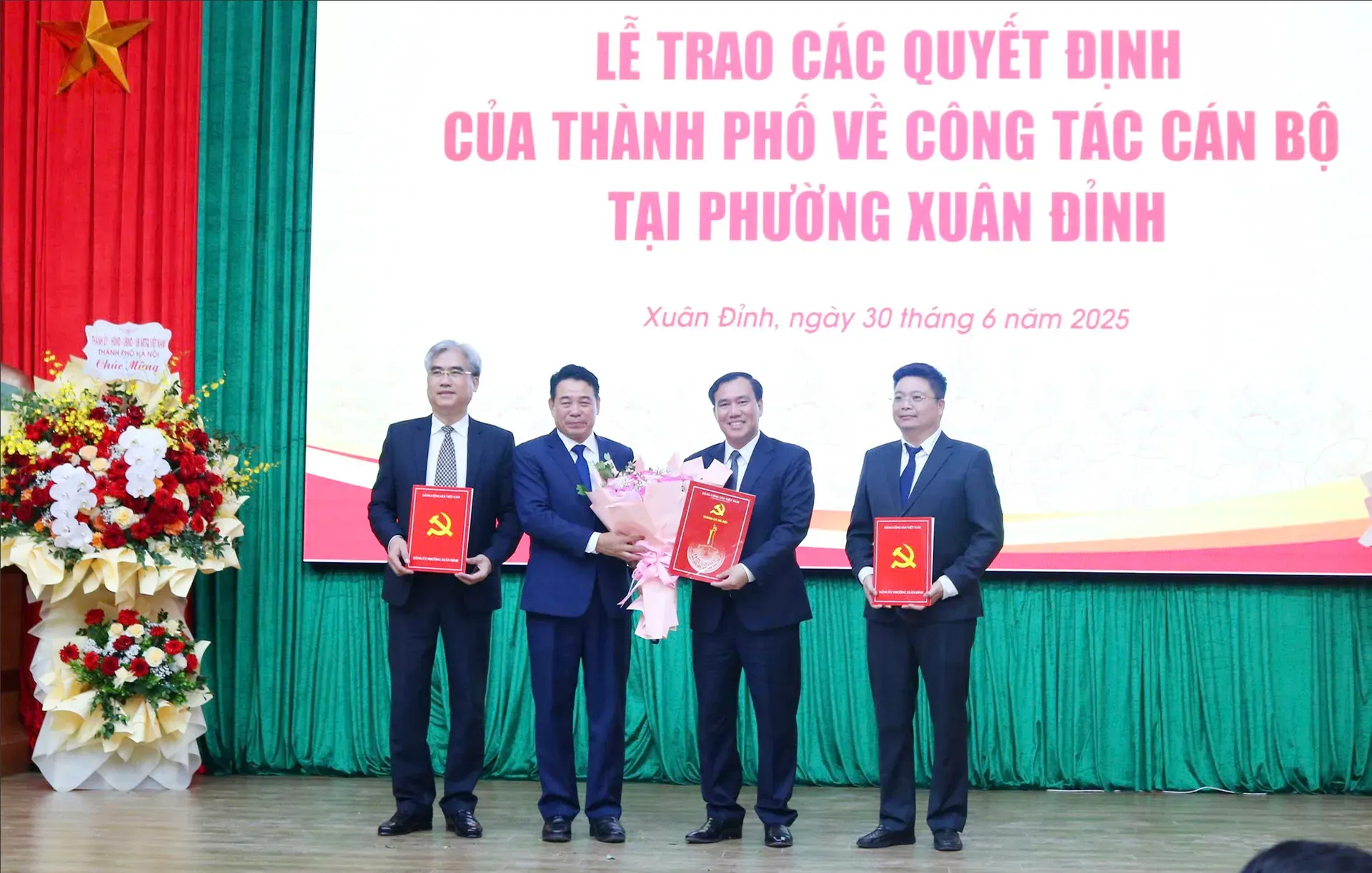 Bí thư Đảng ủy, Chủ tịch HĐND phường Xuân Đỉnh Nguyễn Tiến Thành trao quyết định của Thường trực HĐND TP và tặng hoa chúc mừng Chủ tịch, Phó Chủ tịch UBND phường Xuân Đỉnh.