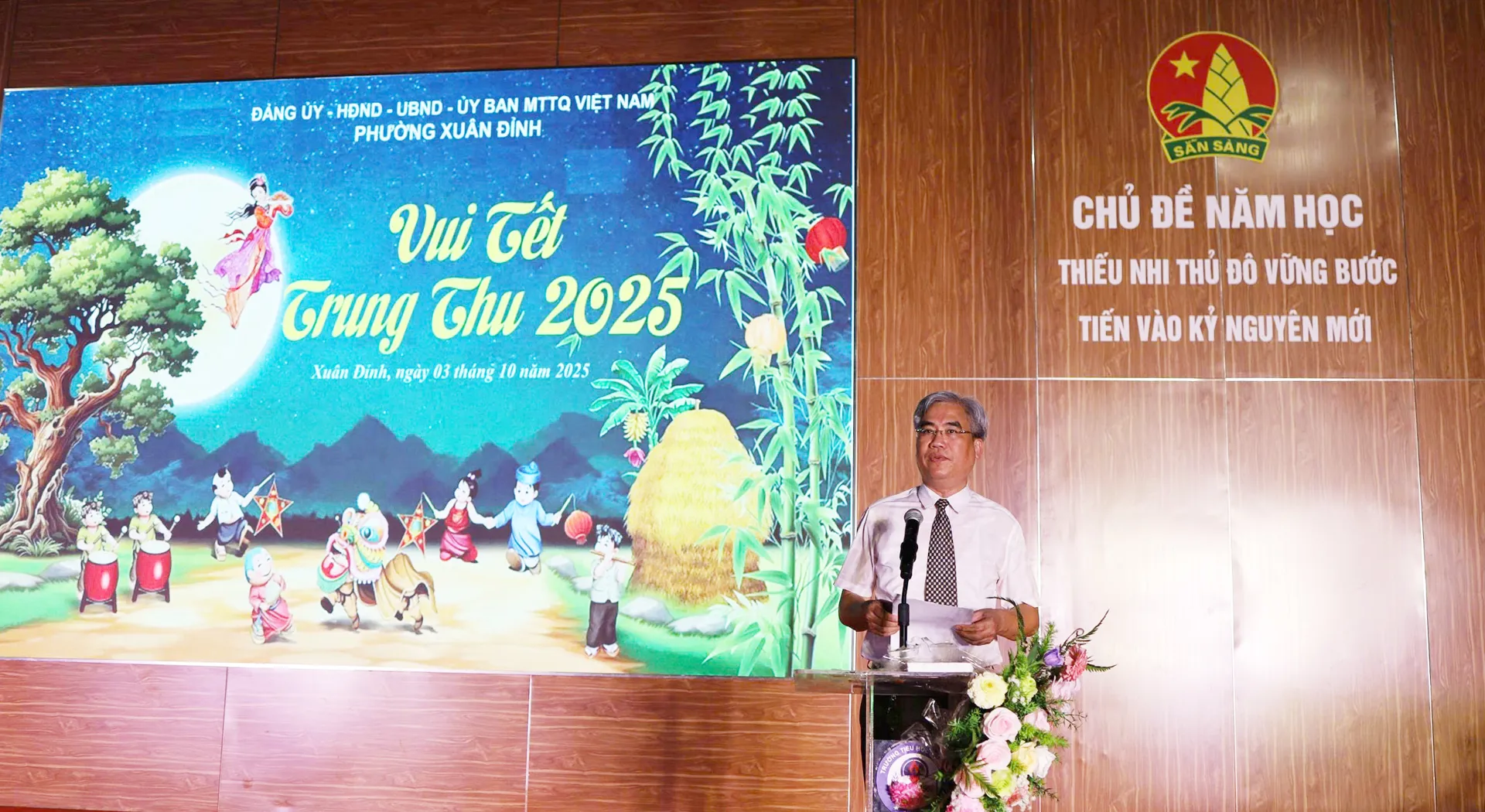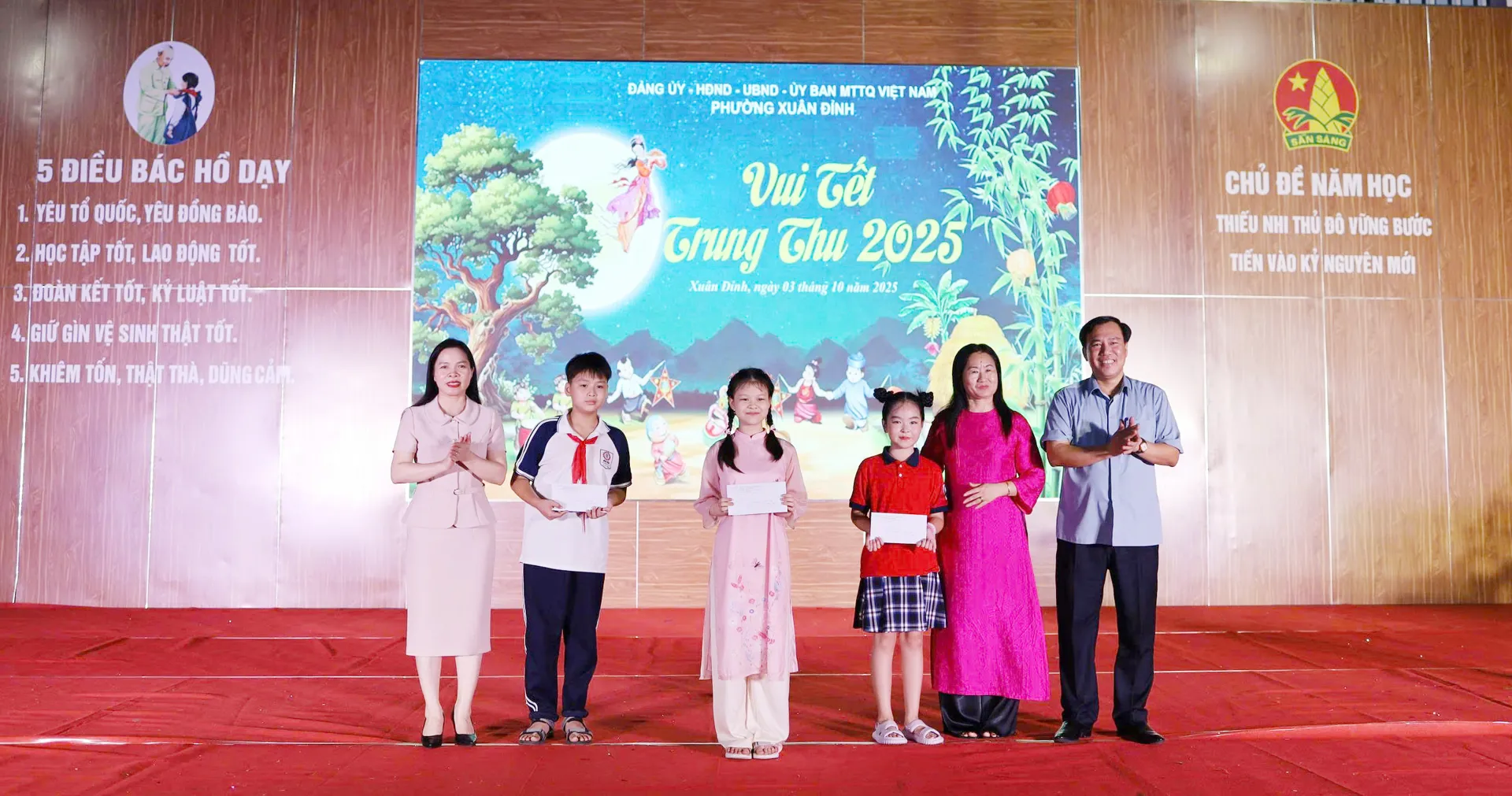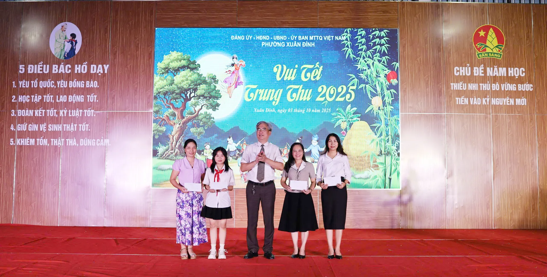 Lãnh đạo phường Xuân Đỉnh biểu dương giáo viên và học sinh tại chương trình “Đêm hội trăng rằm 2025”.