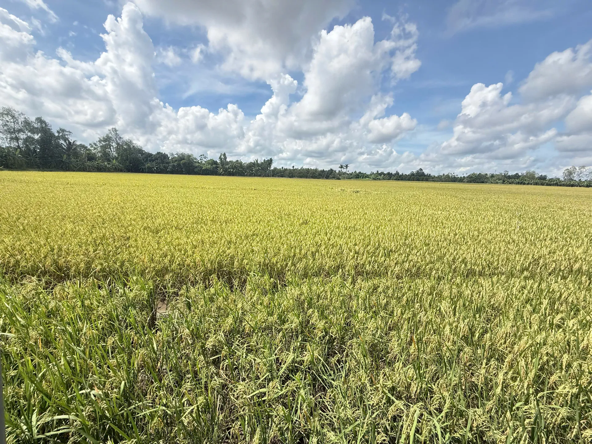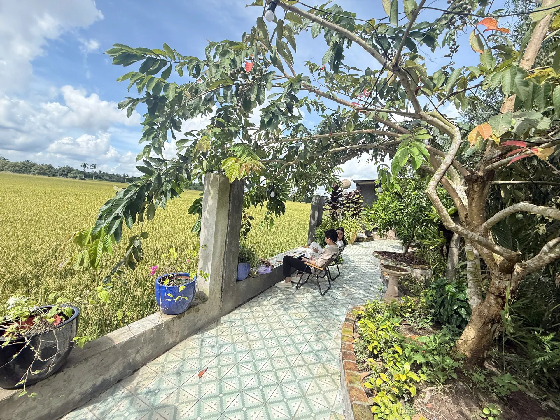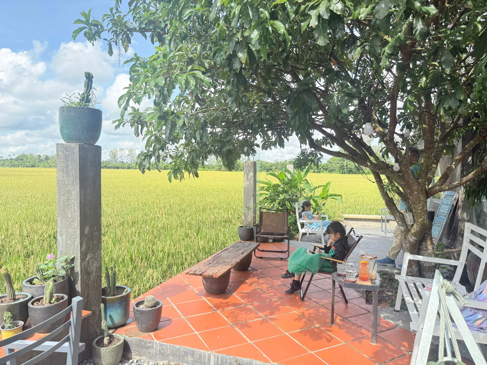 Đặc biệt, phong cảnh tại quán thay đổi theo chu kỳ mùa vụ. Có lúc, thực khách sẽ ngắm nhìn cánh đồng lúa xanh mướt trải dài như tấm thảm khổng lồ. Chỉ tháng sau, sắc vàng óng của lúa chín thay thế, rực rỡ dưới nắng chiều. Thêm vào đó, vườn cây ăn trái quanh năm đầy ắp hoa trái tạo nên một bức tranh đồng quê Nam Bộ đậm chất thơ.