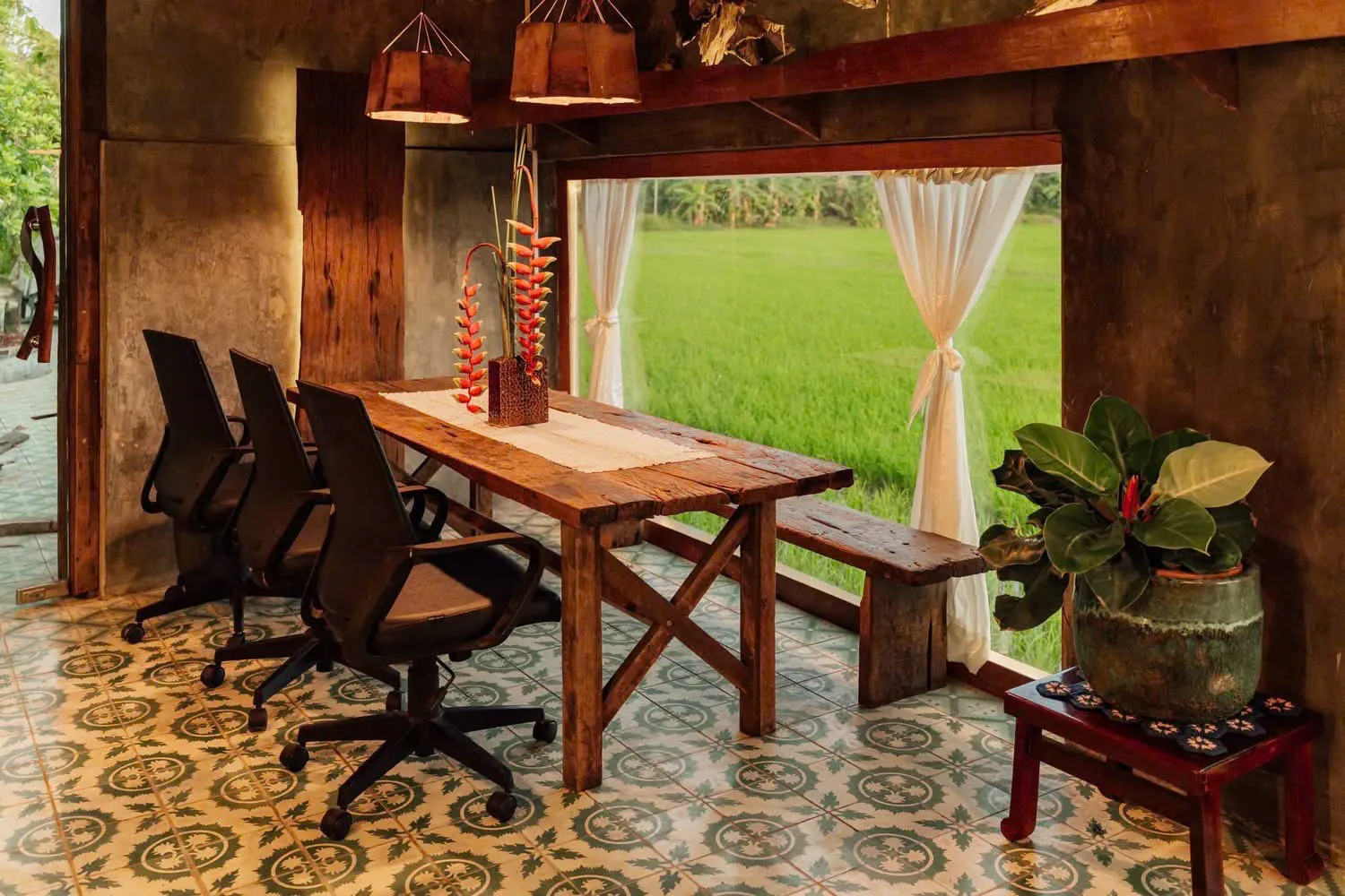 Toàn bộ không gian quán được xây dựng từ những vật liệu mộc mạc: khung nhà gỗ, bàn ghế đơn sơ nhưng vô cùng chắc chắn. Điểm nhấn đặc biệt là những ô cửa sổ bằng kính và cửa ra vào được thiết kế rộng mở, hướng thẳng ra cánh đồng lúa, mang ánh sáng tự nhiên.