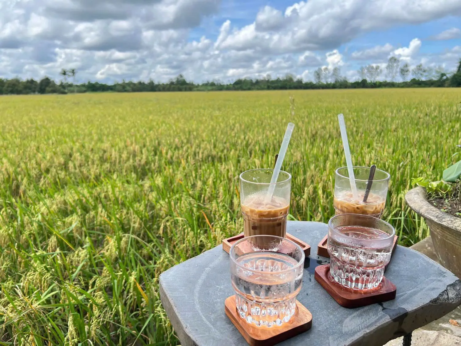 Chị Lê Chinh (38 tuổi, trú tại quận Cái Răng, Cần Thơ) chia sẻ: đến quán cà phê này, tôi như được trở về với những ký ức tuổi thơ hồn nhiên và yên bình. Đó là những ngày theo ba mẹ ra đồng, ngắm cánh đồng lúa trải dài vàng rực, nghe tiếng chim hót và được hít hà mùi lúa chín - mang hương vị rất hương đồng cỏ nội".
