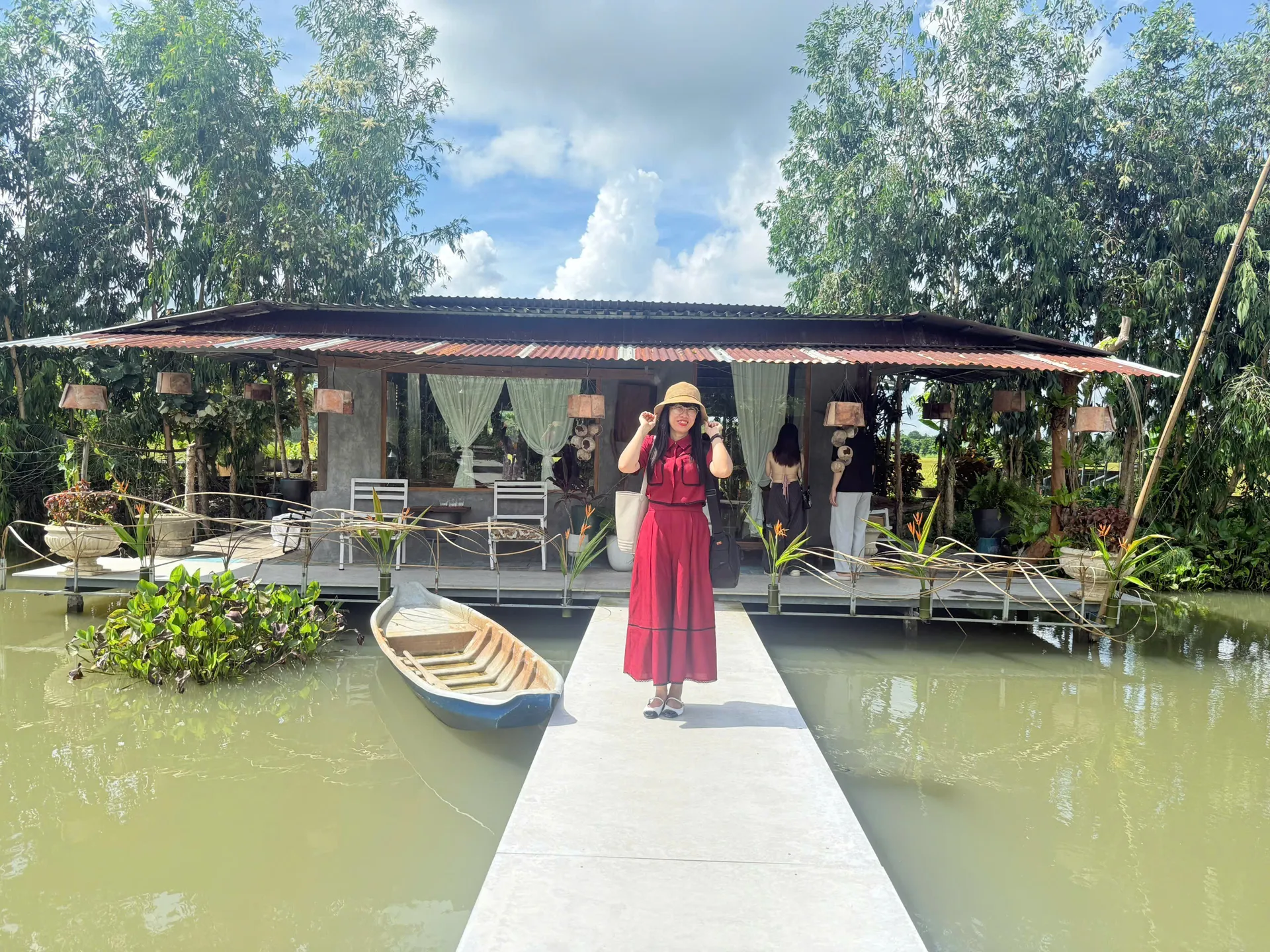 Khác với xu hướng thiết kế cầu kỳ, quán cà phê này chọn phong cách mộc mạc, tối giản, tận dụng tối đa phong cảnh vùng quê sẵn có với hồ nước lớn và cánh đồng lúa. Các lối đi được lát gạch giản dị, hai bên là những luống hoa dại và cây xanh đặc trưng của vùng đồng bằng sông nước.