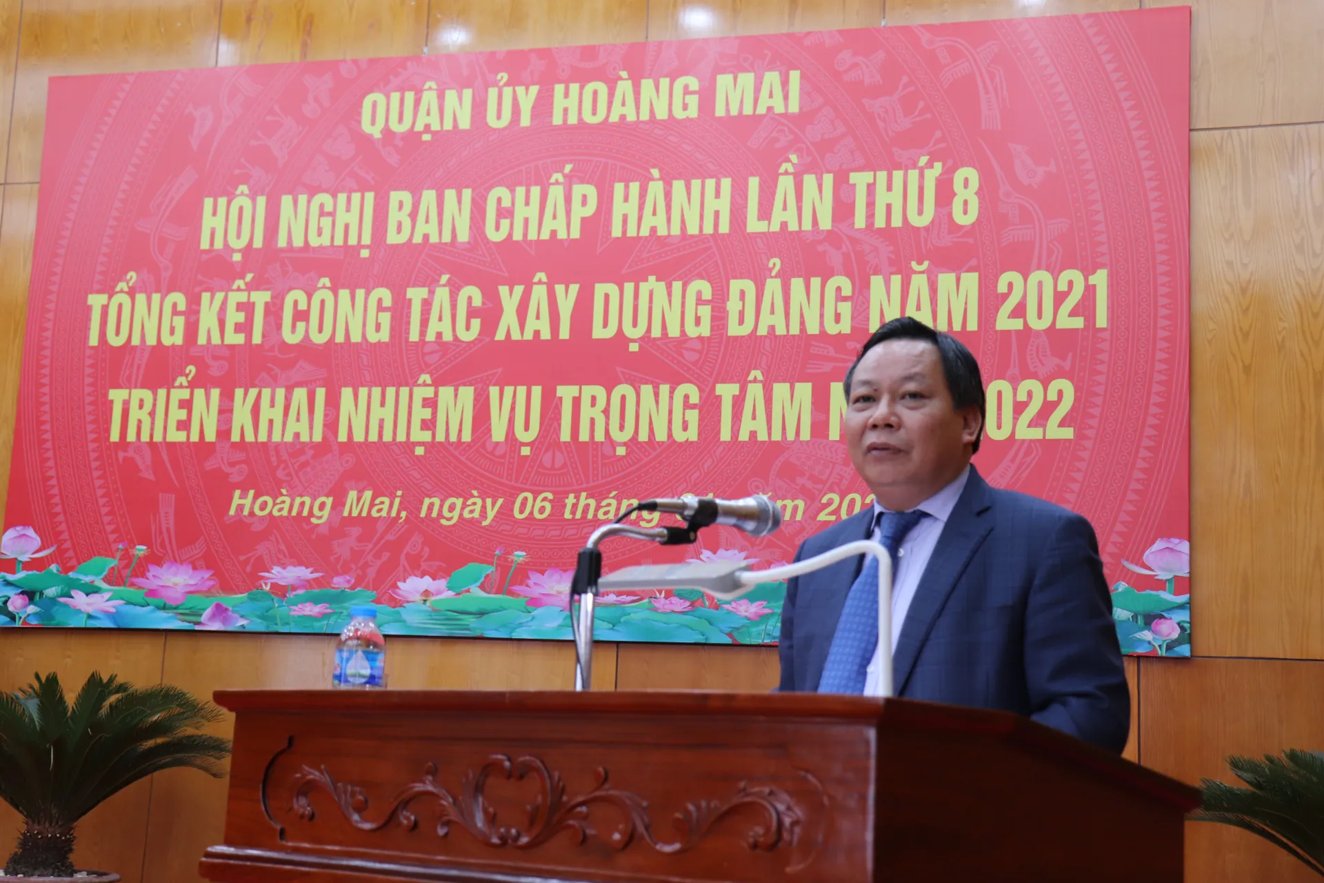 Công tác xây dựng Đảng tiếp tục được quan tâm, trong năm Quận ủy Hoàng Mai đã tổ chức 6 hội nghị Ban chấp hành, 35 hội nghị Ban thường vụ, 43 hội nghị Thường trực Quận ủy, cụ thể hóa ban hành 12 chỉ thị, 5 nghị quyết, 8 chương trình, 49 kế hoạch và 77 thông báo kết luận lãnh đạo, 510 quyết định chỉ đạo kịp thời nhằm triển khai thực hiện các nhiệm vụ phát triển kinh tế, xã hội. Đã có 225/200 quần chúng ưu tứ được kết nạp vào Đảng, đạt 112,5% chỉ tiêu năm 2021; thành lập mới 4 chi bộ đảng trong doanh nghiệp, đạt 100% chỉ tiêu năm 2021.