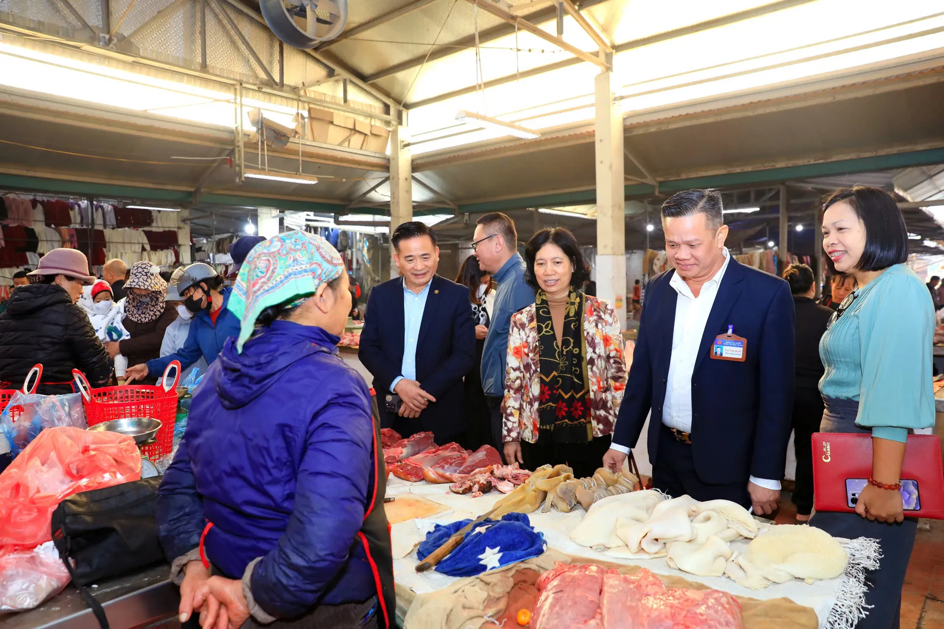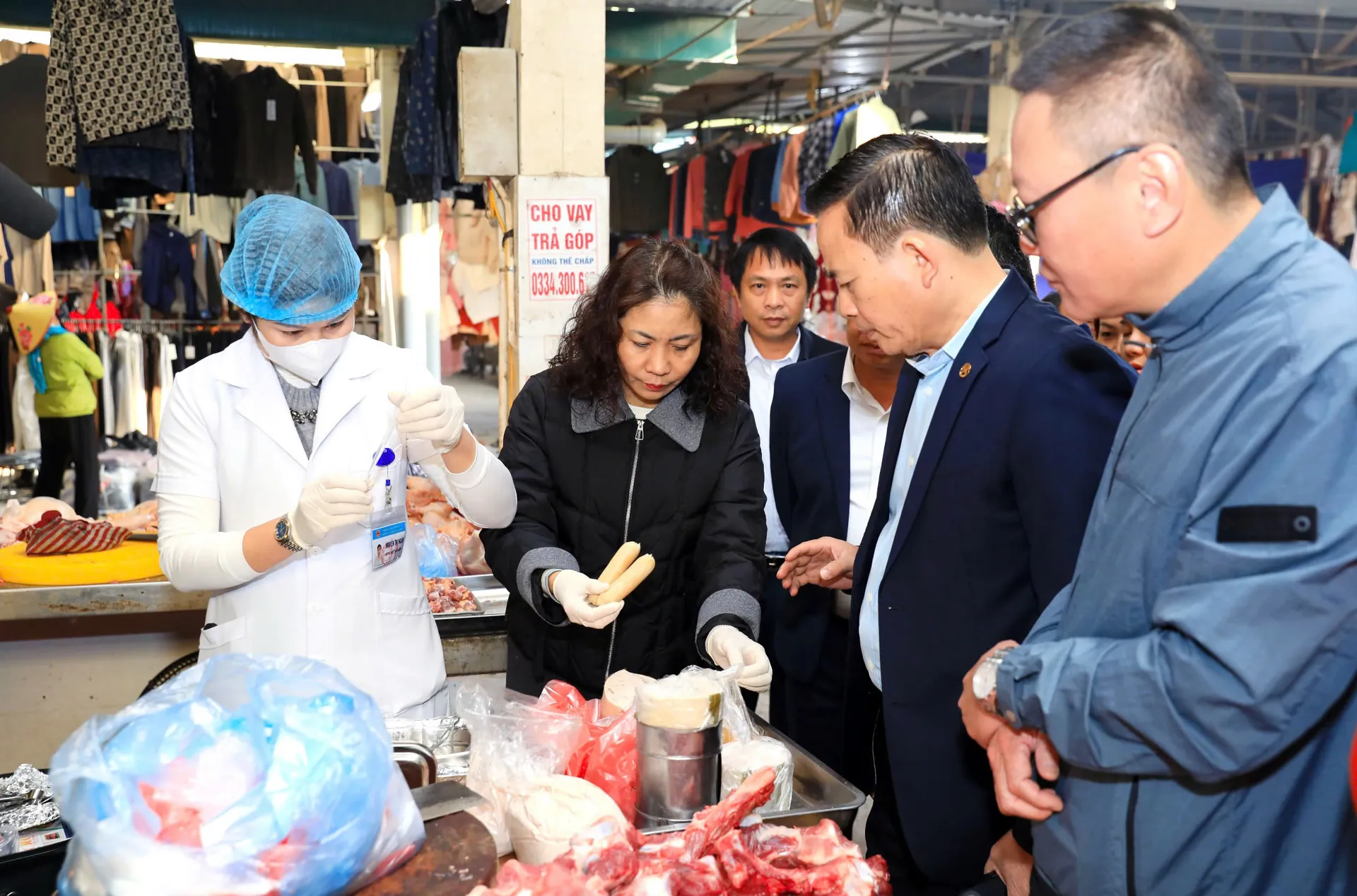 Đoàn giám sát khảo sát tại chợ Bái (xã Đại Xuyên) và lấy mẫu test nhanh với sản phẩm giò, chả, xúc xích
