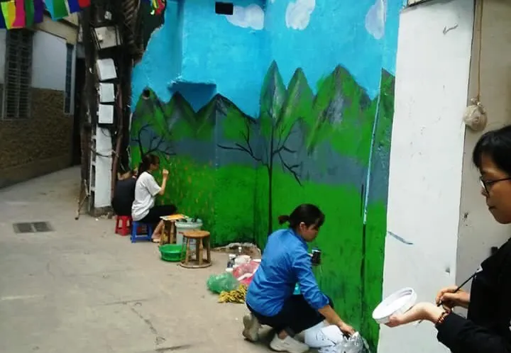 | Đoàn thanh niên phường Thanh Xuân Trung sơn, vẽ lại bờ tường trong ngõ |