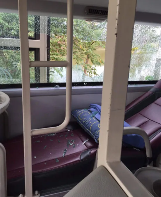 | Xe bị nhóm côn đồ ném vỡ kính khiến du khách hoang mang. |