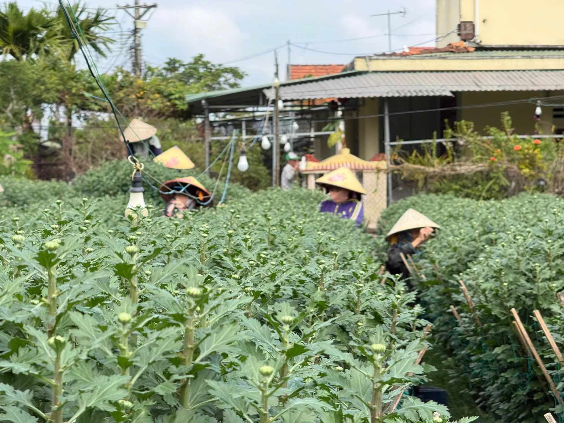 Lao động thời vụ được thuê để tỉa bớt nụ cúc.
