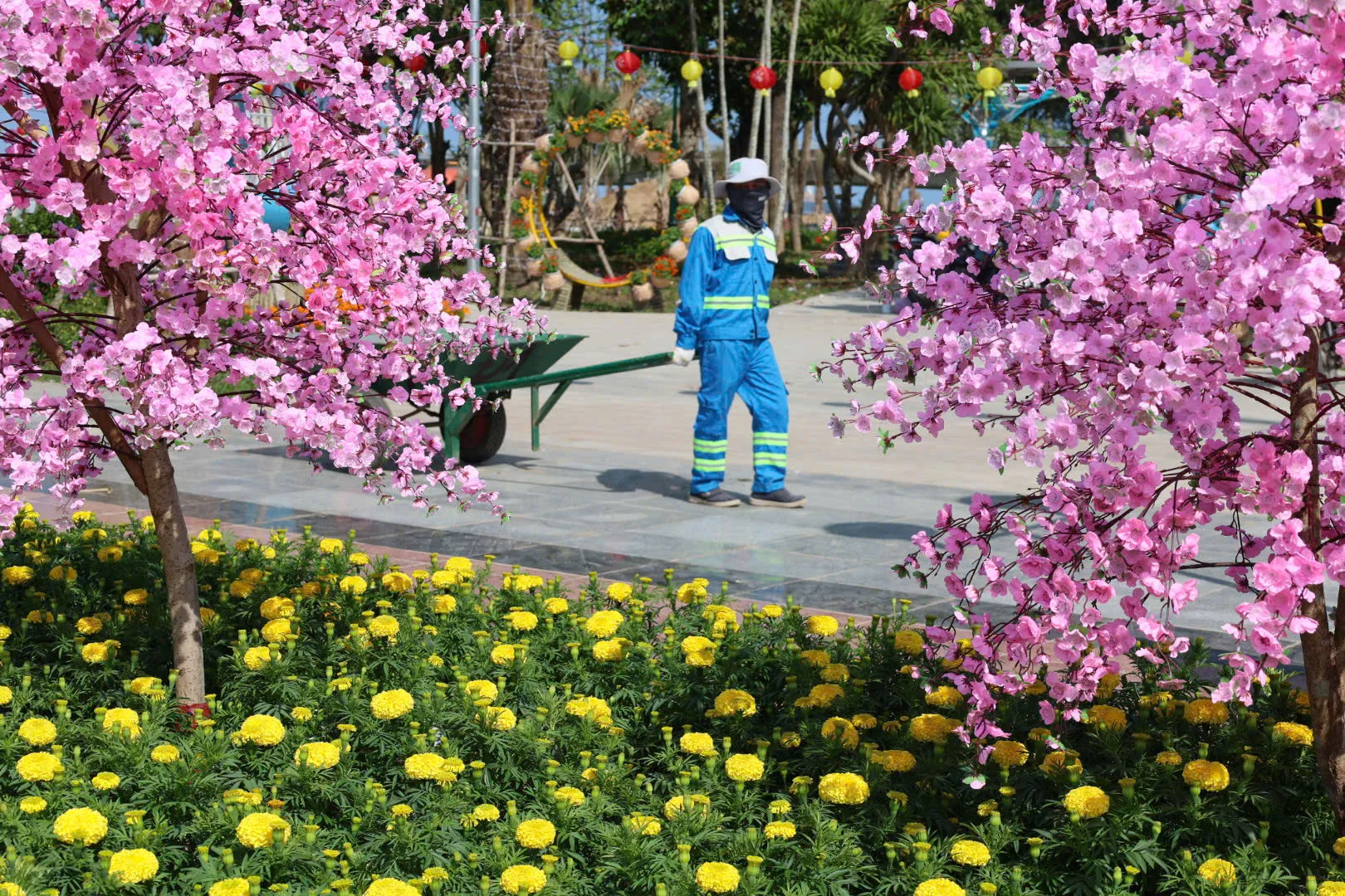 Tại khu vực vườn hoa mini ở phường Cẩm Thành, các tiểu cảnh trang trí Tết đang dần hoàn thiện, khoe sắc giữa không gian đô thị. Những mảng hoa tươi kết hợp cùng các mô hình trang trí tạo nên bức tranh mùa Xuân sinh động, thu hút người dân đến tham quan, chụp ảnh. Để bảo đảm tiến độ, gần 200 công nhân thuộc Công ty CP Môi trường đô thị Quảng Ngãi được huy động làm việc tăng ca, chia ca liên tục trong nhiều ngày qua.